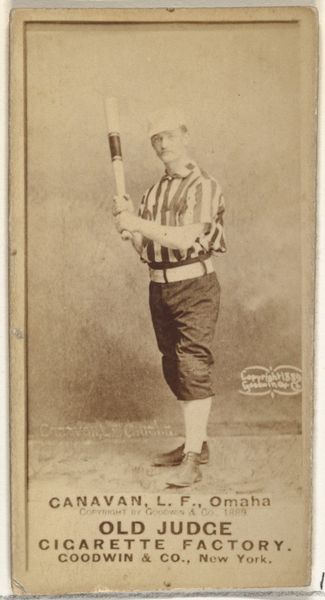 Editor: Here we have a baseball card from 1889, "Joseph R. 'Joe' Walsh, Shortstop," produced by Goodwin & Company as part of the Old Judge Cigarettes series. It's fascinating to see this early form of sports memorabilia, but I find the sepia tone and the athlete's somewhat melancholic pose particularly striking. What elements of the composition jump out at you? Curator: The print provides a valuable opportunity to consider the visual language of early commercial portraiture. Note the figure's positioning within the rectangular format, its static and formal nature creating a visual balance. Observe, too, how tonal variations shape volume in the body. The light, for instance, creates highlights on his left side, contouring his sleeve. Is the figure adequately illuminated? Editor: I notice that the image isn’t perfectly sharp, and the tonal range is pretty limited. I wonder if this aesthetic, and the card format itself, served more than mere advertising. Curator: Indeed. The very materiality of the card, its surface texture, size, and its reproducibility all construct an experience. How does the inscription "Old Judge Cigarettes Factory" affect your reading of the piece? The relationship between the photographic image and this superimposed text serves as an example of textual anchorage and relay. The formal arrangement—photograph above and lettering below—functions to enhance the product recognition. The brand is what sells this drawing of the baseball player. The athlete functions merely to catch the viewer's eye. Editor: That’s a great point. It is a confluence of commerce and culture, then, highlighting both athletic and corporate pursuits. I see this so differently now! Curator: Precisely.