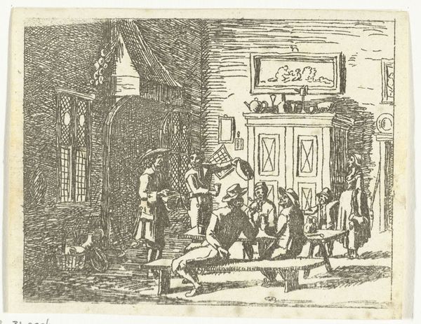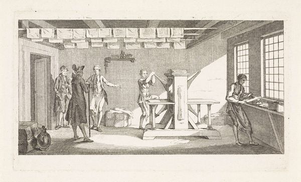 Curator: Welcome to the Rijksmuseum. Today, we're examining an intriguing engraving by Matthijs Pool, created around 1720, titled "Apen in de bakkerij," or "Apes in the Bakery." Editor: My goodness, it's... chaotic! Chimpanzees running a bakery, or at least trying to. I’m struck by how busy it is, yet also a bit unsettling with that glaring fire and watchful owl. Curator: The depiction of animals performing human tasks was a common satirical trope in the 18th century. These "singeries," as they were known, often served to mock social customs and class structures. What stands out to me here is not just the absurdity, but also the social commentary implied by the image. Editor: Absolutely. Look at the level of detail in their tasks: weighing ingredients, stoking the oven, shaping dough. You get a sense for all the different roles, and the effort put in—or maybe the incompetence! How did Pool create such textures through engraving alone? I’m wondering about his workshop setup, his engraver’s tools… the materials and labour that went into its making are significant to consider. Curator: Indeed, and consider the viewers: for whom was this print made, and how would they have interpreted it? Pool was part of a well-established artistic circle in Amsterdam; these images tapped into existing societal critiques and moral observations, likely for a middle-class audience familiar with such imagery. The print’s style draws on Baroque traditions, evident in the dramatic lighting and intricate details. Editor: And speaking of detail, I’m curious about the actual process of making bread in that period – it’s very tactile. Were the various tools carefully researched for accuracy? Or, were they more generic references representing labour in workshops? The fire emanating out of the stove is very theatrical! Curator: That’s a key point: The drama adds an element of spectacle. While not aiming for strict documentary accuracy, the image uses familiar elements – bakery settings, apes enacting work – to deliver a biting satire. The owl, traditionally a symbol of wisdom, perched atop the oven could indicate either knowledge or foolishness in action. Editor: Looking at the final print I’m pondering on what kind of press was utilized to duplicate it, the paper, and where that bakery was located. All these layers in producing and then distributing Pool’s final work give insight into trade practices of that era. It’s quite brilliant. Curator: I agree, thinking about the social messaging around labour mixed with detailed technique offers layered meaning here. Editor: Definitely an enlightening piece of crafted material culture to unpack today!