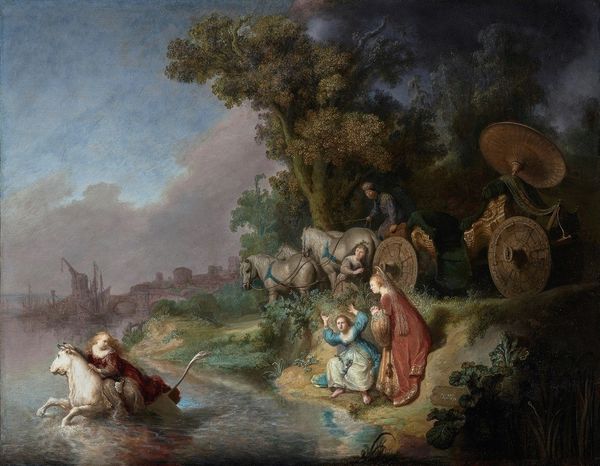 Editor: So here we have Giuseppe Maria Crespi’s oil painting, “Nymphs Disarming Sleeping Cupids,” created in 1705. It gives off a serene, almost mischievous feeling, seeing these figures resting under a gloomy, atmospheric sky. How do you read the narrative of the painting? Curator: It’s intriguing, isn’t it? Crespi places these classical figures in what almost feels like a stage setting, and I am interested in the role the patrons of paintings like this played in their meaning. Genre scenes of mythological or allegorical events provided entertainment, yes, but also reinforced social hierarchies, reflecting elite education and leisure. The disarming of Cupid – the mischievous god of love – could symbolize the taming or redirection of passionate desires into socially acceptable behaviors, and were popular wedding commissions for the aristocracy. How does the depiction of the figures influence your perception? Editor: I noticed that the nymphs are portrayed with very soft features, exuding a certain grace that's quite captivating, despite their playful act of disarming the cupids. Is there something to read into their body language? Curator: Indeed, Crespi’s Baroque style here brings forward some interesting choices of composition. While mythological subjects were typical for elite collections, the naturalism in his depiction of the female figures suggests a turn towards emphasizing human sensuality within even an allegorical context, so maybe it reflects broader shifts in the perception of women in art and society at that time, moving beyond purely symbolic or moralistic representations. What is your final opinion about what meaning to take away from the scene? Editor: That’s helpful. I see it as a fascinating lens into the power dynamics of the time. Thanks! Curator: My pleasure, that makes two of us! Thinking about the institutional contexts, this kind of intimate genre scene reveals much about the lives and values of its original viewers.