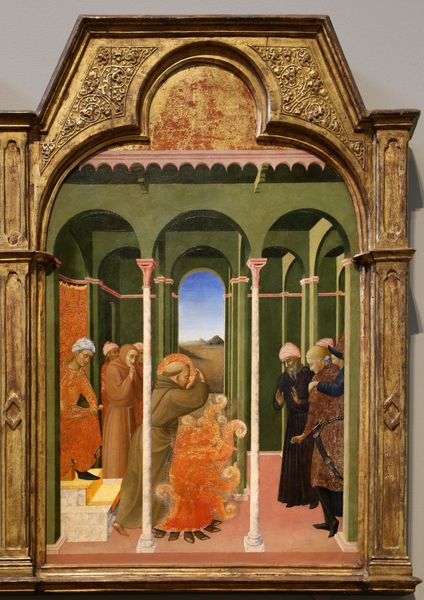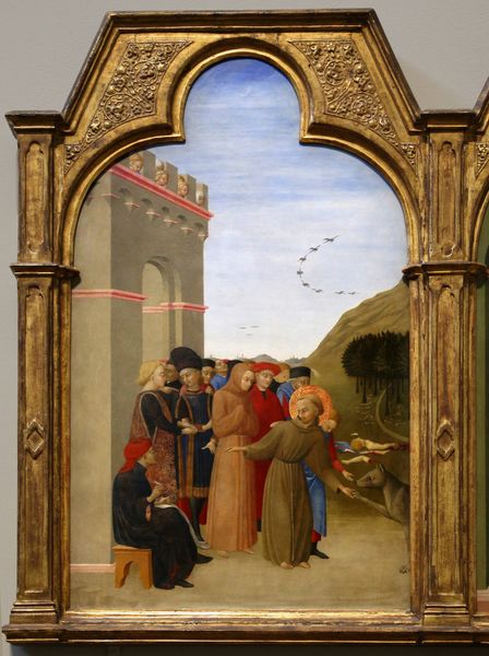 Curator: This is a detail from Stefano di Giovanni's, also known as Il Sassetta's, "Polittico di Sansepolcro," created around 1444. Editor: It feels immediately serene. There's a quiet grace in the composition despite the rather fantastical elements—a floating castle, no less. Curator: The architectural elements, especially that castle with the white flags, definitely stand out. It makes me think of the visual language of power and divinity in religious iconography, a kind of heavenly Jerusalem. What do you make of the other scenes depicted? Editor: They’re like moments frozen in time. You have the angel attending the sleeping figure indoors, the haloed figure assisting the kneeling one, a character praying... each suggests its own narrative. There's something distinctly human about their vulnerability juxtaposed with that ethereal castle, creating a social contrast as if to speak about equity between those from very different walks of life in life and afterlife. Curator: Absolutely. The artist really masters spatial tension—how elements within the painting pull us in different directions, each narrative layer having its own weight and symbol. Editor: The color palette certainly contributes. Those muted pinks and blues feel almost faded, adding to the overall gentle and slightly dreamlike effect. It contrasts rather interestingly with that vivid gold in the architectural details framing the scenes. Do you think those colors reflect a cultural symbolism of that era, the place, or something about that narrative in particular? Curator: It would have absolutely resonated with the era. Gold signifies divinity and royalty, reinforcing the significance of these holy narratives, a very accessible system for people who didn't necessarily have widespread literacy. Those lighter hues could indeed symbolize humility. But color symbolism shifts depending on where and when. Editor: It's easy to get lost in the symbolic details, I agree. And how these symbols are weaponized or celebrated matters deeply in understanding their meanings within social stratifications. Thinking about these interwoven complexities really brings the image into a more meaningful understanding of culture in those contexts. Curator: I find the piece so revealing. These works always leave echoes for the viewer, asking us to bring ourselves into a centuries-old dialogue. Editor: It becomes more about our place in the continuity of cultural interpretation than simply what the artist may have intended to express back then, I agree. Thanks for the dialogue, the continuity, and the opportunity to continue interpreting what matters most!
