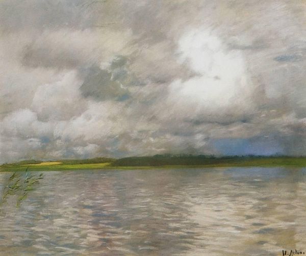 Curator: Welcome. We're standing before Isaac Levitan's 1894 painting, "Summer Evening. River." currently held in the Chuvash State Museum of Fine Arts. Editor: Immediately, I'm struck by the serenity. The brushstrokes are so fluid; you can almost feel the stillness of the water and the coolness of the air. Curator: Levitan, known for his contributions to Russian landscape painting, captured the intimate relationship between nature and the soul, resonating with late 19th-century nationalistic sentiments tied to nature and rural identity. The location itself plays into that context too; imagine how perceptions of a vast, abundant Russia might influence social ideals and structures of power. Editor: Right, and his use of oil paint here really emphasizes the materiality. The colors are layered and blended, capturing subtle shifts in light. Look how the reflections on the water's surface feel almost tangible. How did Levitan's economic background influence his work and subject matter? Curator: Levitan often grappled with feelings of alienation stemming from his Jewish heritage and difficult economic conditions, finding solace in portraying nature's beauty in works that captured not just the aesthetics but the essence of rural Russia and a collective yearning for national belonging, a place where everyone, irrespective of their cultural background or social standing, can find refuge. Editor: Yes! There’s an almost melancholic mood, created by those darker tones along the lower bank of the river contrasted with the luminosity in the sky, almost as if he’s hinting at broader struggles against exploitation of land, or exclusion from material prosperity. What kind of landscape, say what type of labor do you imagine is sustained by this river? Curator: Precisely. Through the depiction of an ideal space that seemingly negates these concerns, the art functions as an escapist, nationalizing agent. The river transforms into a borderless space, accessible for anyone, while silently implying the pre-existing inequalities based on ethnicity and social status. It asks us who and what it actually overlooks and who controls access to it. Editor: Well, on close viewing it appears not untouched. Those pink tinged clouds likely evidence atmospheric pollution in that particular industrial moment in Russian history... It brings a different complexity when thinking of the artist engaging with this image to give social critique, not simply create beauty, while highlighting environmental questions about resource distribution. Curator: That kind of contextual perspective brings fresh layers to his approach. Considering that perspective as well deepens how we appreciate it as more than just surface representation, but a mirror reflecting on Russian history's relationship with class, access, and the human impact on our environment. Editor: Absolutely. It reminds us that even seemingly tranquil landscapes hold complex stories about labor, history, and place.