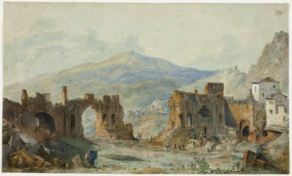 Curator: Immediately, I feel the weight of history looking at Karl Friedrich Harveng’s "Ruinen von Tiryns," created around 1854. The washes of gouache create an almost palpable atmosphere around these ancient ruins. What's your take on it? Editor: My initial impression is one of stark desolation, an almost lunar landscape. The monochromatic palette and ruined structures evoke a sense of forgotten power and cultural displacement. The remnants of the archaic walls become more poignant when positioned on what looks like arid earth. Curator: Exactly. Tiryns, a Mycenaean archaeological site, speaks volumes about early social hierarchies and the labor required to construct such megalithic architecture. When we look at this image, we aren't just observing art, but also the enduring evidence of social structures from millennia ago, right? How did people organize themselves? Who benefited? Who suffered? These questions rise when observing ruins, I find. Editor: Absolutely. In terms of symbols, these massive stones resonate. For archaic people walls were for the wealthy, and these ruins can suggest how much a society cared for cultural or historical preservation. Think about the cyclical nature of empires—rising, dominating, then inevitably crumbling. We read cultural endurance within its landscape. Curator: True, and even Harveng’s decision to depict this scene—landscape painting, with a romantic ruin—is laden with sociopolitical baggage. During this period, classical antiquity was intertwined with national identity, particularly with the rise of nation-states seeking legitimization from the classical past. Editor: And if you want to think further, that fallen tree tells a story! Visually, that form communicates decline and perhaps some form of perseverance in a hard place. If the wall and the ruins show wealth, the tree symbolizes adaptation. Curator: I see your point. Thinking about ruins within our current moment also raises urgent questions about cultural heritage, ownership, and what responsibility we bear toward preserving monuments like this one. Who is accountable for telling the complex histories imbedded in a ruin and how we are supposed to protect them now? Editor: Indeed, Karl Friedrich Harveng offers a gateway into that historical narrative, a meditation on transience and our ever-evolving relationship with civilizations past. Thank you. Curator: Likewise. His choice of Tiryns as a subject challenges us to question the narratives around this landmark, and others—forcing us to consider, perhaps, who tells those stories, too. Thank you.