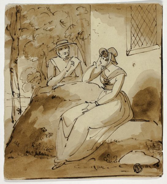 Curator: Mark Rothko, better known for his color field paintings, created "Two Seated Women Conversing" in a markedly different, earlier style, sometime before his iconic turn. Doesn't it strike you as incredibly intimate? Editor: Yes, intimate and incomplete. The sketchy brushstrokes, the exposed ground—it's like catching a glimpse of something private still in the process of becoming. I notice how the composition leads the eye towards the negative space between them, hinting at a connection, or maybe even a distance. Curator: Precisely. You can almost hear the murmur of their voices, see the unspoken tension in their postures. And it feels so authentically observed, not posed, you know? The watercolor and the almost hasty lines contribute to that sense of a fleeting moment captured. Editor: Absolutely. It's a departure from Rothko's later abstract work, of course, but one can see elements of his emerging style here. Note how the forms are simplified, how color is used expressively rather than representationally, particularly the soft lavender against the stark white. Curator: That use of color is enchanting, like whispered secrets between old friends, or a quiet disagreement lingering in the air. Perhaps there's a push-pull of affection and discord inherent in all our conversations? Editor: An astute observation. The structural simplicity creates a space where viewers can project their own narratives. The focus is not so much on precise likenesses, but on the relational dynamics between these figures, captured through gesture and hue. Curator: I think this piece teaches us a lot about conversation itself— how much is said without words, and how much the spaces between us define our connections. What do you take away most? Editor: It reminds me of how a single captured moment, seemingly unfinished, can speak volumes about human interaction. I think Rothko created here a visual poem on female friendship and connection.