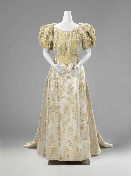 Editor: So, here we have an evening dress from the early 1900s. It's currently residing here at the Met. The mixed media, textile construction really strikes me; it almost feels like a story waiting to be told. What symbolic meanings or stories do you see woven into the fabrics and design of this dress? Curator: The dress is an exceptional example of Art Nouveau aesthetics. Note how the linear patterns in the black panels evoke images of night-blooming flowers—almost funerary. In contrast, the ecru sections and lace point towards rituals celebrating weddings. It reflects society's complicated, often opposing feelings about women. Does this garment appear constrained or liberated to you? Editor: I can see that; there is certainly both opulence and restraint! Liberated...I am unsure. The waist does seem awfully cinched. Is there more that I'm missing here? Curator: The "S" silhouette, achieved through corsetry, pushes the bust forward and the hips back. Observe the lace—its handmade quality denotes status and hints at traditional femininity. At the time, women wore symbolic meanings on their sleeves, using clothes to communicate their roles and aspirations in a rapidly changing world. What is the overall feeling that the dress provokes in you? Editor: Melancholy, yet undeniably beautiful and complex. The lace, now that you mention it, provides such complexity and juxtaposition. Curator: It certainly speaks to both fragility and power. Thank you for sharing your perspective. Editor: Thank you for bringing new meanings and nuances to my eye.