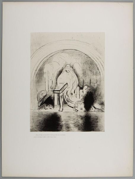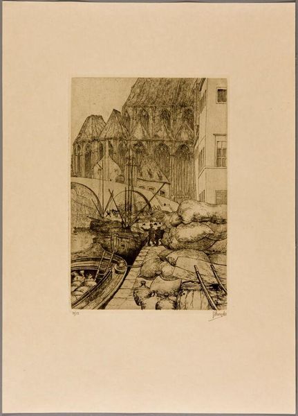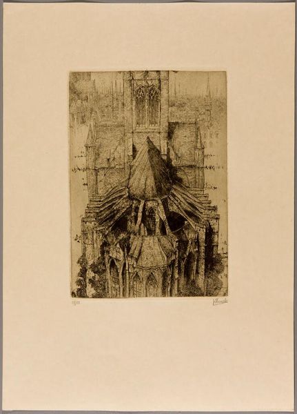 Curator: Jules de Bruycker, born in Ghent in 1870, created "Valley Road." What strikes you first about this piece? Editor: It's brooding. The darkness of the gothic architecture looms. The light in the alleyway feels almost trapped. Curator: Indeed. Notice how Bruycker contrasts the imposing cathedral with the ordinary scene of figures gathered at the street's edge. The window above adds to the feeling of being watched. Editor: And the composition itself—the converging lines of the buildings, drawing the eye into that compressed space. The texture created through the etching process emphasizes the aged, almost oppressive feel. Curator: These narrow spaces carry layers of cultural memory, the weight of history. Bruycker often explored the psychological impact of urban architecture, those feelings of confinement or being overwhelmed. Editor: The strategic use of shadow and light, it’s very effective in conveying that particular emotional tenor. Curator: Yes, quite potent imagery. It's fascinating how deeply Bruycker could embed feeling within such a stark visual framework. Editor: A powerful piece, even now.