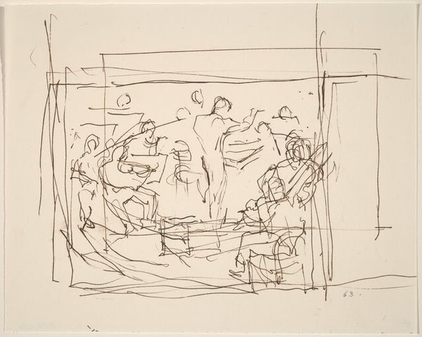 Curator: "Studio II (Atelier II)", created by Alberto Giacometti in 1954, a graphite drawing that’s also considered a print, seems to show a collection of sculptures within a workspace. I'm immediately drawn to the almost chaotic layering of lines. How do you see this piece, especially concerning his artistic process? Editor: The linear quality definitely feels raw and immediate. The lines create depth, but the space still appears flattened. Considering this work is called 'Studio II,' I'm curious about the physical studio where he worked, how that space shaped his materials. Can you elaborate on that relationship? Curator: Certainly. The graphite acts as both a tool for depiction and a direct record of the artist's hand, highlighting the physical act of creation. The medium becomes less about representation and more about documenting labor. What do you notice about the objects and figures in the composition themselves? Are they polished finished works, or do they feel more like sketches? Editor: They certainly appear like sketches. It looks as if he is examining the process of art creation, a reproduction that gives rise to yet another reproduction. Curator: Exactly! This approach blurs boundaries, doesn't it? Consider that his sculptures were often elongated, roughed textures suggesting constant reshaping of material; the lines in his drawing seem to mirror this tension. It all comes down to what the materials *do* within that studio space. It prompts one to question the art status of a seemingly unfinished artwork and to view the studio as itself, a site of material practice and knowledge production. What might you take away from Giacometti’s Studio II? Editor: I see how his artistic process emphasizes labor and challenges art consumption. Thanks. It highlights how closely intertwined the finished product is with the physical workspace. Curator: Precisely. And it reframes the studio not just as the origin of art, but as a subject worthy of artistic exploration itself.