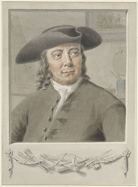 Editor: This is a self-portrait by Hendrik Tavenier, likely dating between 1744 and 1807. It's a graphite drawing with really delicate shading, and I immediately notice the interplay between light and shadow, which gives it this sort of ethereal quality. How would you analyze this piece? Curator: The success of this portrait hinges on its handling of light and shade. Notice how Tavenier uses subtle gradations of graphite to model the planes of his face. The light source appears to come from the left, casting delicate shadows that define the contours of his features. Chiaroscuro becomes a critical component in representing form and depth in two dimensions, yes? Editor: Absolutely. The contrast is there but gentle, not dramatic. How does this play with the surface details, like in his clothing? Curator: Observe how the artist renders the patterned fabric of his jacket. The graphite is applied with precision, but remains sensitive to the play of light. There is no single dominant form within this pattern, but the relationship of the small repeating figures with each other that determines a balanced and visually stimulating area. In fact, look how this play continues from the drawing behind the model all the way to the implements displayed in front. Everything connects, reflecting its neighbors with varied contrast, saturation, value. It suggests not only the artist's meticulous observation but also his understanding of texture and surface. Editor: It's like a tapestry of textures working together. I'm seeing more in it now! Curator: Exactly. And consider the formal choices. The figure is presented bust-length, framed against a simple background, and there is attention to geometrical components—horizontal plane of the table and painting. Each area interacts and emphasizes its opposite, further building to create a visual network. What does this contribute? Editor: It emphasizes Tavenier as an observer. All of these smaller observations make something impactful! Thank you for expanding my perspective.