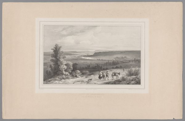 Curator: Ah, this engraving, "View of a Remote Village near Tondano," by Paulus Lauters. Created sometime between 1843 and 1845. What strikes you initially? Editor: It's surprisingly serene. Despite the sharp detail typical of engravings, there’s this wistful, almost dreamlike quality to it, particularly the soft fading into the distant horizon. Curator: Precisely. Lauters, though Dutch, clearly dips into Orientalism here, exoticizing the landscape, especially with that lush, almost overwhelming vegetation in the foreground framing the gentler village beyond. Editor: Framing is key. Notice how he uses the darkness of the foliage to accentuate the light flooding the open space and lake in the distance, a very Romantic contrast. Then there's the placement of figures along that winding road, small but distinctly present—leading the eye deeper into the scene. Curator: Right, and they add an intriguing layer of narrative, don’t they? Who are these travelers, observing this land? Are they part of the scene or separate from it? Also, given Lauters never travelled to the East Indies, how might he interpret his understanding of Romanticism from afar to illustrate this scene? Editor: A great question! Perhaps looking at period conventions gives us hints, because the figures are neatly arranged along a perfect S curve created by the path. So there's a tension. On one hand, you have exoticism from afar mixed with close inspection to technique, resulting in something very calculated rather than totally fantastical or naturalistic. Curator: Well put. I find myself wondering about the local population's reception of images like these. This image really pushes and pulls me; I feel an unease reflecting on the Western gaze. Editor: It’s certainly a lens tinted with the era’s perspective. However, regardless, or perhaps despite that, I cannot but concede that I find myself swept away into the image as well. It makes me wonder about the power of a place like this and all the people within the world portrayed here. Curator: Absolutely, an intriguing dialogue to have, for sure.