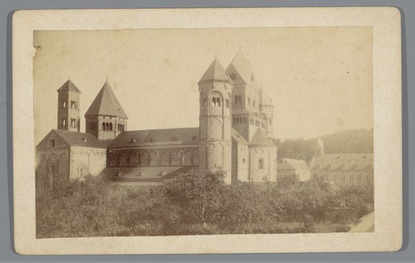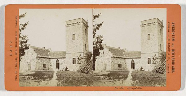 Curator: Well, isn't this something? Pieter Oosterhuis, capturing the Kleine Houtpoort in Haarlem. The photographic print dates from around 1859 to 1865. A sturdy gate pictured frontally with a symmetrical view. Editor: Yes, very symmetrical indeed, almost painfully so! But also...charming? It's that sepia tone, isn't it? Instantly ages the picture, bestowing a nostalgic aura. It's almost a portal. Curator: You keyed in on something crucial, portals. The Kleine Houtpoort wasn't just an entry point into Haarlem; it was a symbolic gateway between safety and the unknown. These gates represented civic identity, community boundaries, marking who was "in" and who was "out," so to speak. Editor: Oh, interesting, because I can't shake off this unsettling vibe, though. Those skeletal trees and that silent passageway make me think this wasn't such a friendly or welcoming place, no, rather the opposite. There’s a sense of enforced order. Rigid. A little… oppressive? Curator: Oppressive perhaps for some. Haarlem at this time was a prosperous trading city. The gate signified power and security, a well-defended commercial hub. Also, observe the way Oosterhuis has framed the structure with trees. It's quite deliberate and visually unifying; they give a sense of depth, anchoring the structure to the surrounding land, the tall slim shapes providing balance. Editor: True. Okay, I see what you mean. But, listen, even with the historical context, the absence of any human figure amplifies that feeling. Makes me think that these gates don’t let people enter as much as confine them inside! Curator: An astute observation. This gate, or city tower no longer exists, but is permanently marked in history by photography. Editor: See? That melancholy again. Knowing it’s gone does add another layer. Perhaps that's where that unsettling sensation came from originally. Curator: Well, thank you, these structures and their stories fade unless we revisit them and draw them back to the front through shared exploration, reflection, and dialogue. Editor: You're absolutely right. A bit like bringing the past, or in this case a tower, back to life—if only for a moment.