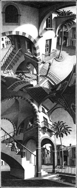 Curator: This etching, titled "The Prisons, Plate V," comes to us from the hand of Giovanni Battista Piranesi. Editor: My immediate impression is one of claustrophobia. It's this dizzying array of arches, scaffolding, and walkways… overwhelming. And look at that strange light, or maybe it’s smoke, billowing near the top! It's like a nightmare rendered in ink. Curator: It is indeed a powerfully disorienting image. Piranesi created these "Prisons" in the mid-18th century, a period rife with discussions about architecture's role in social control and public works programs. Editor: It’s fascinating to think about this as a commentary on labor too. The scale feels…inhuman. It dwarfs those tiny figures. Are they prisoners, or perhaps workers building this monstrous space? And I wonder what kind of industrial process is producing that smoke. Curator: That ambiguity is key, I believe. We can consider how Piranesi critiques the idea of rationally planned societies when such visions become spaces of confinement, no matter their utopian intentions. Notice, too, the layers of perspective tricks he uses. There are stairs that seem to lead nowhere and arches that conceal more architecture behind them. Editor: It certainly throws the idea of linear perspective right out the window, doesn't it? It creates a visual tension that’s very unsettling. It reminds me a bit of a factory, everything automated but where is the agency? I suppose architecture and design choices always implicate or control its users. Curator: Exactly. Piranesi presents an anti-monument, critiquing social engineering. Editor: What I am struck by, even just thinking about the production of this work as an etching, is how the crosshatching and deep shadows have to be achieved through incredibly exacting labor to construct and then print! It amplifies the sense of scale, while thinking about the intense time it took to realize it through production. Curator: Indeed. "The Prisons" speaks to enduring anxieties about progress and power. Piranesi captured that moment when the Enlightenment’s promise of order seemed to tip into something altogether more menacing. Editor: Absolutely. Thinking about how this maze of stone and shadow was itself laboriously produced really complicates my sense of awe—it’s as unsettling in its making as in its representation! Thanks for putting this in a helpful frame for consideration!