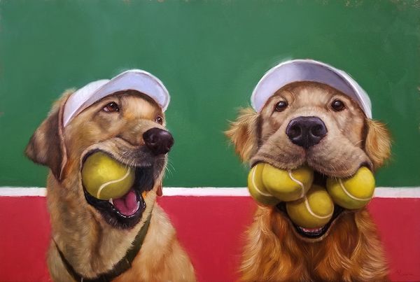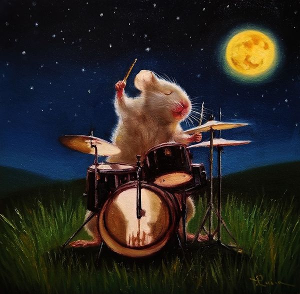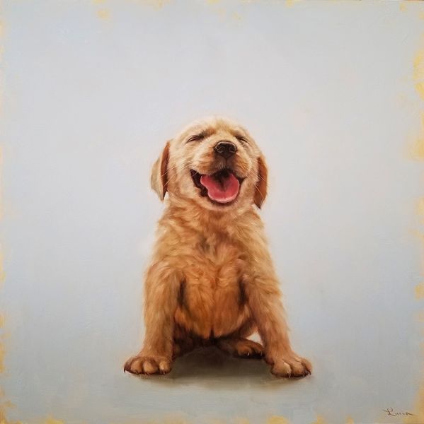 Editor: So, this is “Woof Jam,” an oil painting by Lucia Heffernan. It’s…a dog with headphones, eyes closed, looking completely blissed out. It’s almost comical. What's your take on this work? Curator: Immediately, I'm struck by the way Heffernan uses animal portraiture to explore human emotions. Dogs have become incredibly potent symbols in our culture, embodying loyalty, companionship, and unconditional love. Here, the headphones act as a contemporary symbol of escapism and pleasure, instantly creating a connection with the viewer. Editor: That makes sense. I was so focused on the humor I didn't think about that. The dog is really anthropomorphized. Curator: Exactly! Consider the choice of expression: closed eyes, lolling tongue. It's pure, unadulterated joy. This imagery carries such an emotional weight. Have you considered the red of the headphones against the soft, neutral tones of the dog’s fur and the pale blue background? Editor: It definitely makes the headphones pop, draws your eyes right to them. Curator: The use of color further reinforces that idea of intense experience and links to a sensory experience. It’s a clever, almost subconscious association, don't you think? A clear example of how artists throughout history have utilized color as emotional cues. What does the gesture of touching the headphones convey to you? Editor: Connection? Immersion, maybe? It suggests he's really feeling the music. It's like a modern-day Saint Cecilia, but with a very good boy! Curator: A very good boy, indeed! It also touches upon how our modern world immerses itself in a sensory experience. These contemporary interpretations echo our psychological connection to iconography across time, reinterpreting the familiar to reflect the present. Editor: Wow, I went from just seeing a cute dog to thinking about cultural memory and sensory immersion! Thanks! Curator: It's fascinating how a seemingly simple image can be a gateway to deeper cultural understanding, isn't it? It makes you wonder what symbols we’re creating right now!