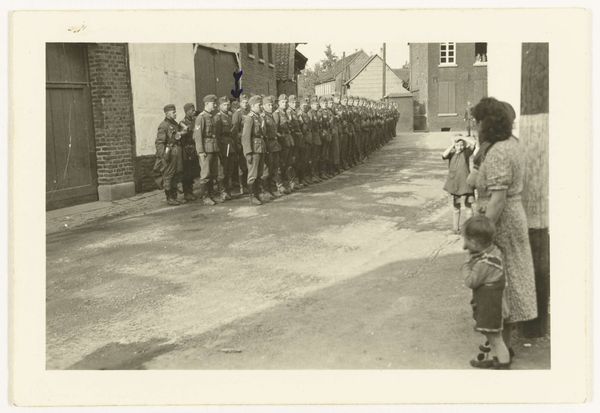 Editor: This photograph, titled "Militairen bij appel", meaning something like "Soldiers on parade", was taken sometime between 1941 and 1945. It's a gelatin silver print held here at the Rijksmuseum. The stark black and white tones and the rows of uniformed figures create quite a rigid, almost oppressive atmosphere for me. How do you see this work functioning visually? Curator: Indeed. Let us first consider the formal elements. Note the photographer's calculated use of perspective. The converging lines draw the eye towards a vanishing point, amplifying the sense of depth and the endlessness of the ranks. Do you observe the textures and tonal gradients at play? Editor: I see what you mean. There's a subtle gradation from the darker foreground to the lighter background that emphasizes the regimented formation, doesn't it? It's almost like a visual metaphor for a kind of dehumanization. Curator: Precisely. Now, consider the play of light and shadow. How does it contribute to the overall composition? Editor: The lighting is fairly even, but there's a contrast between the uniformed figures and the landscape behind, and how it almost fades away. What impact would you say that has on its visual balance? Curator: Note the structural relationships between the forms and the overall spatial dynamics of the image. It suggests order but the background threatens to fall apart behind them. Ultimately, what matters are the purely formal relations in play here, and the tensions produced as they resonate and fail to gel. Editor: I understand. By focusing on composition, we are examining how such formal choices and spatial arrangements create the artwork's primary qualities. Thank you for making me see beyond my immediate reactions to the image and to consider formal analysis. Curator: A crucial exercise. Close looking allows one to grasp an entirely new aesthetic vocabulary and access hidden meanings within works such as this photograph.