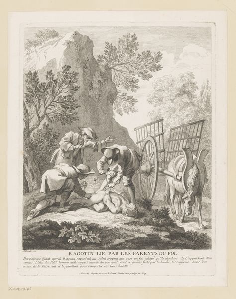 Curator: This etching, "Esau and his family parting ways with Jacob," was created by Pietro Monaco in the mid-18th century. It resides here at the Metropolitan Museum of Art. Editor: My first impression is one of departure and a distinct lack of sentimentality, considering the familial bond being severed. The light seems evenly distributed, denying us dramatic chiaroscuro and further flattening the emotional impact. Curator: The image presents Esau's narrative of leaving his brother, Jacob. According to the Old Testament, their reconciliation suggests themes of forgiveness, familial estrangement, and perhaps destiny, as Jacob deceives Esau. It reminds us of inheritance rights and sibling rivalry that persist throughout history. Editor: From a purely formal standpoint, observe how the artist uses varied line weights to define forms. Notice the figures rendered in the foreground with darker, heavier lines that gradually lighten as our eye moves into the receding landscape. Curator: Precisely. And each figure takes on symbolic weight. Esau, the patriarch, is typically associated with primal vigor, land, and earthly pursuits—he contrasts sharply with Jacob, who signifies intellect and divine favor, elements echoed visually in how they each engage with their surroundings. Editor: The composition seems somewhat static for a departure scene. There's a lack of dynamic diagonals that you might expect in baroque art. The landscape isn't fully integrated; rather, it functions more as a backdrop than an active participant. Note that this is an etching, so that's already one step removed in a way, re-presenting the pictorial construction. Curator: Right. Although the figures of Esau's family carry water jugs, suggesting preparation for a long journey, it could also be read as a reminder of how water acts as a signifier of cleansing and rebirth as well as essential for the literal continuity of life. It is an interesting choice to associate departure and provision in this way. Editor: Ultimately, it’s in the cross-hatching and meticulously rendered details that we find evidence of Monaco’s technical skill, crafting form and volume where tones and highlights are flattened in translation from painting to engraving. Curator: Indeed, a cultural touchstone rendered with technical mastery, provoking questions that echo even today about choices made and paths taken. Editor: A piece inviting further viewing beyond its representational components, and technical ingenuity, as one seeks its nuanced form.