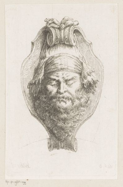 Curator: Here we have Christian Bernhard Rode's "Mascaron met mannenkop" from 1759, currently housed at the Rijksmuseum. My first impression is its intriguing air of stoicism. The face is captured with such meticulous detail using pen and charcoal. What are your initial thoughts? Editor: Well, immediately, I’m drawn to the process of making it, particularly the relationship between pen and charcoal, this interesting use of line and smudging and the way the artist utilizes the materiality to create a kind of texture and light. The texture is somewhat rough. What’s the context for these mascarons, I wonder? Curator: The historical context here is really fascinating. Mascarons, these grotesque faces, were architectural elements meant to ward off evil spirits and often represent marginalized figures, particularly those deemed threatening to societal order. So Rode, by crafting this drawing, engages with those loaded themes around fear and othering present in 18th-century Europe. Editor: That's interesting in relation to the physical creation itself. To create something with a pen on paper to act as protection reminds me a bit of an apotropaic object. Do we know the socioeconomic status of the artist? I am interested to know how this artwork circulated around this time and who owned this work. Curator: Rode moved within educated circles. His art, influenced by the enlightenment, served often as moral commentaries and reflections on power. His choice to depict the masculine head perhaps comments on the changing notions of masculinity, class, and intellectual power within the era's social dynamics, when notions around citizenship and the value of labor started changing rapidly. Editor: So, was it meant to subvert or uphold those power structures? The production of the drawing and the status of materials themselves played a vital part in how art history will assess it. Curator: It is complicated. His art often navigates ambiguity. It isn't clear if Rode meant to challenge the system or offer some nuance of thought in these times. By bringing this particular type to paper Rode might have also invited for a critical re-examination of these very common ornaments and those figures from the margins they were to protect from, through art. Editor: The act of translating it to drawing perhaps makes that critical reflection even stronger. It is something meant to adorn grand architecture now put on paper for scrutiny and distribution. I would love to research the artist and his engagement with materials further. Curator: Exactly, considering the subject, medium, and era allows us a peek into past anxieties, and power structures which can spark our reflection now. Editor: And thinking through the process and its historical and artistic lineage lets me reflect on where my analysis fits within the current day.