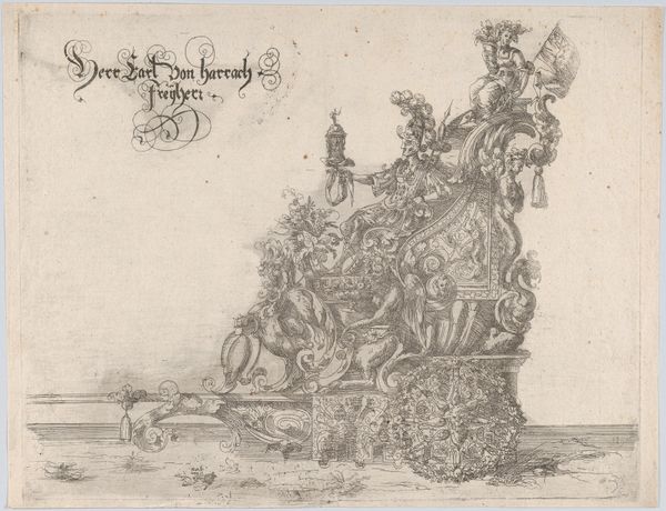 This is an engraving of a "Procession, with a male and two female figures seated on a float," created by an anonymous artist. The print depicts a regal float carrying three figures. We see a king-like figure holding a hammer, a woman with a crown, and another figure behind them. The float itself is a spectacle, adorned with ornate carvings and pulled by figures that seem to blend into the design. Given the era and style, this piece likely reflects the social hierarchies of its time. Royal processions were not just displays of power but carefully constructed narratives about leadership and societal order. The presence of both male and female figures invites us to consider the roles and representations of gender within these power structures. The print probably served to document or celebrate a specific event, reflecting the cultural values and norms of its society. The engraving provides a glimpse into the visual culture of its time, offering insights into how power, gender, and identity were publicly presented and perceived.