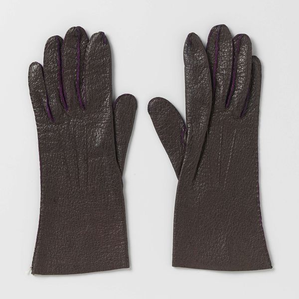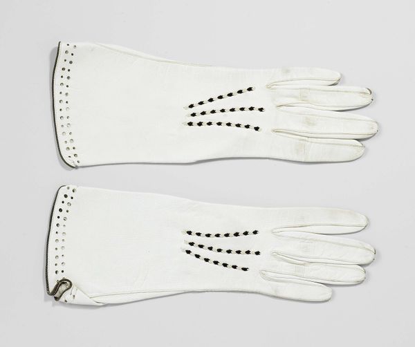 Curator: These black suede gloves are a striking image, part of a Maison de Bonneterie collection and taken sometime between 1950 and 1975. Notice the elegant, simple form? Editor: I do, it is rather unassuming, isn't it? Like an object out of time. Something darkly futuristic maybe, rendered in retro materials. There's something almost ghostly about them. Curator: Ghosts from a not-so-distant past. The mid-20th century was a transformative era and even something like a pair of gloves carries symbolic weight from that period. Black, especially, has rich associations. It's the color of mourning, elegance, and authority. Editor: And disobedience! It makes me think of beatniks in smoky jazz clubs, you know? Sunglasses at night, gloves in the shadows. It’s as if they conceal secrets in every seam. It also reminds me of vintage clothing catalogues and photography from that time... kind of a coldness. Curator: Coldness is a great word. A photograph can do that - freeze something and invite inspection and interpretation. Think about the texture too. Suede offers a tactile quality—soft yet durable, luxurious, yet practical. The choice of material is very intentional; there are a range of symbolic indicators. Editor: Yes! This tactile coldness feels particularly important somehow, you imagine the feel on your skin while experiencing it on a screen! These feel... cinematic. Imagine them gripping a steering wheel in a Hitchcock thriller! They embody intrigue. They conceal… and maybe even manipulate. Curator: Quite! And let’s not forget the simple function they served. Protection, warmth, fashion... even class distinction. But even mundane items transform in time, taking on fresh cultural implications in different eras and social contexts. The photographic representation only serves to reinforce the mystery. Editor: It’s funny how such plain things start buzzing when you shine light onto their meaning! It's like the glove has secrets sewn into its lining and the photograph tries its hardest to reveal. Curator: Indeed! Everyday artifacts holding a complex narrative and ever changing symbolic presence. Editor: That’s pretty marvelous, when you think about it!