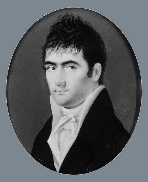 Curator: Looking at this portrait, I feel an immediate sense of reserve. Editor: I agree. I see a certain quietude. Here we have Charles Fraser's portrait of Rev. Christopher Edwards Gadsden, painted in 1819. The oil painting is currently part of the Metropolitan Museum's collection. Curator: The sharp contrast of the black coat against his stark white collar focuses my attention right on his face. His expression, caught between serenity and seriousness, almost asks for our reflection. I see how powerful the symbology of light and dark is in communicating something like divine presence or righteousness. Editor: It's interesting you mention righteousness. Gadsden, as an Episcopalian minister, held a significant role within his community. These portraits were tools, you know? This was made to broadcast a certain public image, both civic and pious. Curator: Oh certainly, it wasn't just a simple likeness. Fraser's artistic choices actively crafted a perception of authority and spiritual devotion. Notice his gaze; it suggests thoughtfulness and inner contemplation. I'm drawn to how Romanticism influences portraiture, emphasizing emotion as something foundational to the image. Editor: Right. The placement of such portraits in churches or prominent family homes served a definite function: solidifying the cultural influence of the sitter and upholding the social order of the time. It's about more than just memorializing someone. Curator: Indeed. What seems simple contains layered messaging that would speak directly to those viewing the painting in its original context. Today, its meaning becomes more subtle and speaks to enduring psychological questions regarding faith and character. Editor: Yes, it has transitioned into an art object, to be observed and contemplated outside the church. Viewing the past through works such as these prompts me to wonder what kind of a legacy any of us may be so actively, yet passively, constructing. Curator: Exactly, thinking about legacy connects this moment with his and, now, our own as observers. A fascinating journey back and forth.