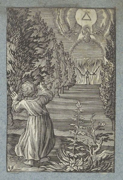 Editor: So, here we have "Child on earth sits in rays of light from a throned angel in heaven" by Christoffel van Sichem II, an engraving from 1628. The figure is being struck by what looks like a divine ray. It feels...dramatic, but in a restrained, Old Master sort of way. How do you interpret this work? Curator: Well, looking at this print through a historical lens, we see a convergence of religious and social forces that shaped its meaning. Consider the rise of printmaking itself. This wasn't simply about creating images; it was about disseminating ideas, controlling narratives. Editor: I see... it's not just the image but also how it was circulated. Curator: Exactly! The artist is using visual rhetoric to influence viewers and shape their understanding of their relationship to the divine. Think about the period—the Reformation was still casting a long shadow. Visual depictions of faith were inherently political acts. What sort of viewer was this artwork designed for? How might it have been used or perceived by different social classes? Editor: It makes you think about accessibility. Prints were more affordable than paintings, right? Perhaps this imagery aimed to influence a broader audience. But I hadn't really thought about the act of reproduction being such a powerful tool in shaping ideology! Curator: Precisely. The print medium allowed religious iconography and related world views to spread, contributing to religious and political agendas. The landscape and allegory aren't just pretty scenery or narrative devices. They are elements loaded with cultural and institutional context. This work then becomes part of a much bigger conversation about religious expression. Editor: That really changes how I see it. It's not just an illustration; it's a tiny piece of a larger power structure. Curator: Indeed. The political ramifications of distributing such imagery provides crucial insight into its meaning. Editor: Thanks, it gives the artwork and the context so much meaning now.