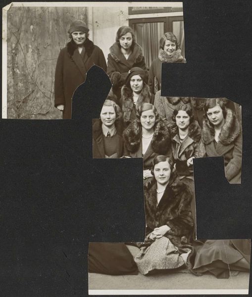 Curator: This silver gelatin print, likely from the 1930s or 40s, presents a group portrait—or rather, a partially excised group portrait. The work, title being "Deels uitgeknipt groepsportret van deelnemers aan een cursus van de Koloniale School voor Meisjes en Vrouwen te 's-Gravenhage," which translates to "Partly cut-out group portrait of participants in a course at the Colonial School for Girls and Women in The Hague." Editor: Gosh, what a melancholic vibe. It’s got that serious, almost wary air of old photographs. The partial cropping, I’d hazard, gives it the eerie feeling you get when you realize history is full of untold stories and hidden figures. Like there's so much we can't see. Curator: Indeed. The missing portion activates a negative space that implies loss, or at the very least, deliberate exclusion. Compositionally, we can see the sitters, primarily young women, arranged in tiers, hinting at hierarchies of knowledge perhaps emblematic of the colonial schooling system itself. The faces—those we *can* see—project varying degrees of engagement and reservation. Note the texture of the coats and the contrast with the flatness of the wall, an exterior. The tonality favors middle gray scales, reinforcing its documentary purpose while paradoxically distancing us from it through its aesthetic construction. Editor: It makes you wonder *who* was snipped away and *why.* Those fur collars look heavy and restrictive, though. And everyone looks so formal... except, if you squint, that young woman at the bottom seems like she might just have a hint of a smile. Curator: Perhaps a subtle defiance. Yet the print's material qualities, particularly the physical act of excising parts, further complicates any straightforward interpretation. Consider the hand, the agent of removal – its motivations. What historical forces are embodied here? The composition draws the eye back to those missing components. Editor: You can’t help but conjure stories, right? Each figure seems laden with a past, and then *someone* just physically erases portions of it. It adds another layer, doesn't it? Gives you a funny sense of time, loss, and the power that inheres even in historical images. Like whispers you can nearly catch on the wind. Curator: Precisely. Through its formal organization and strategic deconstruction, this portrait prompts an important question about the selective nature of archives and their latent ideologies. Editor: It certainly made me think, not just about the photograph itself, but also about who gets remembered... and how. Curator: An enduring question rendered tangible. Editor: Right then, shall we?