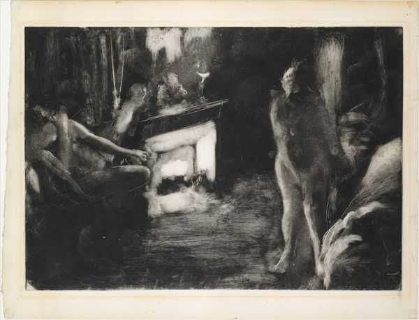 Edgar Degas created this print, *Woman by a Fireplace,* using etching and aquatint. The image depicts a domestic scene in late nineteenth-century France, a woman tending to someone lying in bed. What might seem like a tender moment is also fraught with the complexities of social class and gender. The setting is a comfortable interior, but the figures are shrouded in shadow, their expressions and relationship unclear. The woman's dark dress and the somber tones may hint at her social standing, possibly a servant or caregiver, while the person in bed could be the mistress of the house, or a child, depending on the nature of their co-dependence. Degas was interested in the changing social roles of women. Was he commenting on the plight of those who were employed in domestic service? Or the ill health that kept women confined to the domestic sphere? Art historians consult letters, diaries, and household records to more fully understand this world. The meaning of this image, like much art, is rooted in its specific cultural and institutional moment.
