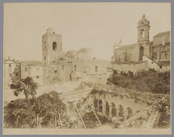 Curator: I’m immediately struck by a sense of monumental decay in this stereo photograph. There’s a melancholy beauty, a kind of haunting silence permeating the image. Editor: Indeed. We're looking at Édouard Baldus’s circa 1862-1866 photograph, "[Church of Saint-Honorat, Arles]," currently housed at the Metropolitan Museum of Art. Baldus captured this stereoscopic view, utilizing toned paper, a method which lends this sepia tone, enhancing that feeling of faded grandeur. Curator: The arches—even fragmented—speak volumes. Arches often symbolize aspiration, the link between the earthly and the divine, yet here they stand partially collapsed, the heavens perhaps further away than they once seemed? The human desire to connect with the eternal, now broken... Editor: Baldus was active during a period of significant social and political upheaval in France. Considering this context, might this image speak to a broader sense of societal fragility? The crumbling church perhaps mirrors the shifting foundations of power and belief during the Second Empire. Curator: That’s a compelling perspective! Or perhaps Baldus simply saw inherent beauty in ruins, echoes of earlier faiths and aesthetic styles mingling in the landscape? There’s something deeply romantic in picturing lost orders and broken things—aren’t they the perfect reminder of vanitas themes, especially potent in places of worship? Editor: Yes, that visual drama is potent but there is an elision of people that adds an unsettling layer. The absence almost amplifies the historical weight—the struggles and changes this space has weathered are somehow heavier for not showing those most affected by them. Who worshiped here and what happened to them? It feels vital to remember them as we analyze an aesthetic remnant of their world. Curator: You know, focusing on these particular visual ruins allows me to reimagine these themes of impermanence—a powerful paradox indeed. Editor: Absolutely. It pushes us to reflect not only on what has been lost but how we choose to remember and interpret these histories in the present, to whom did this location even offer solace, freedom, power or even constraint?