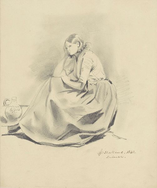 Editor: This lithograph, "Vrouw op een bank denkt na met dolk boven haar hoofd" – Woman on a bench contemplates with a dagger above her head – by Honoré Daumier, made in 1844, has a very unsettling feel. There’s so much tension in the image, amplified by the presence of the dagger. What do you make of this? Curator: Well, look at the title, first. That juxtaposition, that tension, is precisely Daumier's point. He's not simply depicting a woman, but a woman "thinking" with a looming threat, which manifests as the dagger hanging over her head. Note how it floats there in the same field of vision as a romantic landscape. Editor: The contrast is definitely there, between domestic interior and the external threat... So you see the dagger as a psychological symbol? Curator: Precisely! Daggers often function as signifiers of betrayal, violence, or repressed emotions, sometimes even freedom depending on who is holding the blade. What is that woman contemplating that drives her to her wits' end, enough to be haunted by such a symbol? The answer might have its roots in its date: 1844, the year it was made, was fraught with pre-revolution tension. It makes you wonder... are there other cultural touchstones that we might be missing? Editor: So it goes beyond a simple portrait of a woman? Curator: Absolutely. Think about her surroundings, her pose – everything contributes to a story far bigger than just her. Her very dark features stand out; her interior torment threatens to break her apart. What if the title is purposefully reductive in how the woman is the one "thinking," the one generating this "attack," not someone else? Food for thought! Editor: That's a really interesting take. I didn't consider how many layers of meaning a single image could hold. Thanks for opening my eyes. Curator: My pleasure. It’s a rewarding experience to see how historical anxieties can crystallize into potent and haunting images like this.