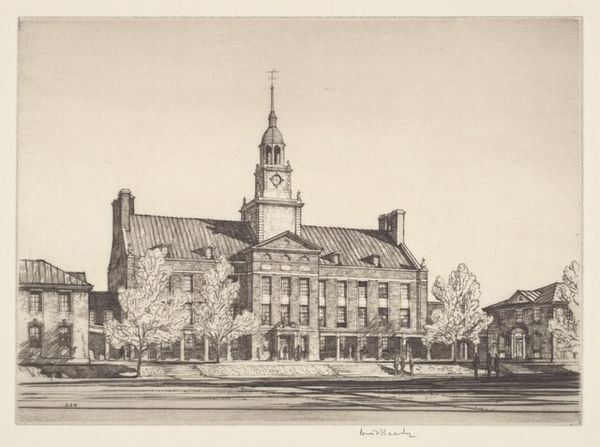 Samuel Chamberlain's etching of Old Nassau Hall presents a symphony of lines, carefully composed to evoke a sense of depth and architectural grandeur. The monochromatic palette accentuates the texture and form, inviting a tactile experience through visual means. The composition strategically uses tree branches as a framing device, leading the eye towards the focal point of the building's iconic tower. This technique creates an intimate yet expansive view, playing with perspective and scale. Chamberlain's masterful rendering of light and shadow adds a layer of complexity, highlighting the building's facade and intricate details. The artist uses etching as a medium to explore the interplay between precision and spontaneity, challenging traditional notions of architectural representation. The structural arrangement reflects a dialogue between nature and built environment, questioning how each defines the other. This work invites a reconsideration of how we perceive architectural spaces and the stories they embody.
