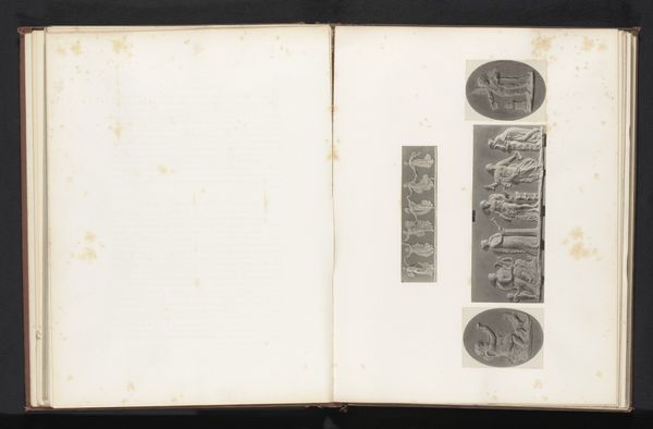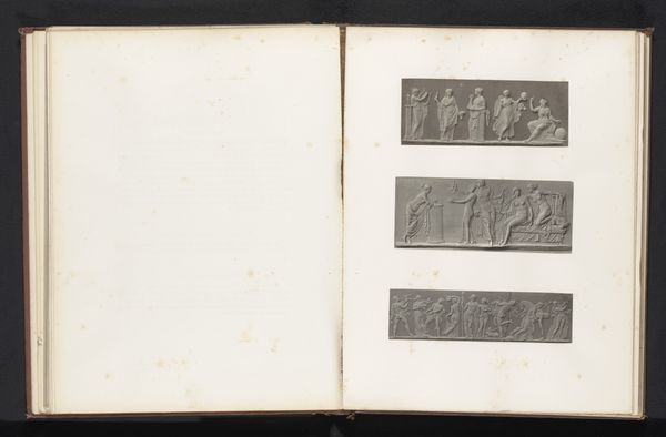 Curator: This is an engraving showcasing bas-reliefs depicting Minerva, Juno, and Jupiter, created before 1873 by Joseph Cundall. I'm struck by how these prints translate the original sculpted forms. Editor: The immediate effect is one of controlled power, wouldn't you agree? There's a stateliness to the figures, but presented as monochrome prints in an album, it reduces these powerful classical icons to easily-digested commodities. Curator: Precisely! The choice of presenting them as prints speaks volumes. This method made classical art more accessible to a wider audience, impacting how these powerful images were perceived and circulated in society. Did accessibility enhance the classical style’s prestige or cheapen it? Editor: An interesting question, but isn’t the creation of prints like these just another means of reproducing the Roman elite's appropriation of earlier Greek art? And now Cundall appropriates those appropriations! What materials were used to create these bas-reliefs in the first place, and by which artisans? And to what purpose would these figures have served in Roman culture? This, for me, points to their true historical context. Curator: Of course. But consider the role these images play now, within the context of 19th-century visual culture. They are, in a way, being re-purposed and re-packaged for a different consuming public. A public eager to participate in an educated discourse. The figures act as visual touchstones. Editor: Certainly, it reveals much about how ancient art continued to function, providing authority to contemporary societal power structures by evoking a connection to the supposed superiority of previous regimes. Even reproduced as relatively affordable prints, that feeling of access could well reinforce prevailing social hierarchies. Curator: I think examining Cundall’s choices reveals a deliberate strategy in popularizing classical themes, transforming their meaning. These figures weren't merely aesthetic objects; they were tools of cultural dissemination and instruments in the construction of collective identities, mass produced, made readily available. Editor: I agree. The prints speak volumes about art's role in shaping, justifying, and mediating the grand narratives of power that stretch through centuries. Curator: A lens into understanding the socio-cultural values of a society as much as the artistry of the depicted subjects.