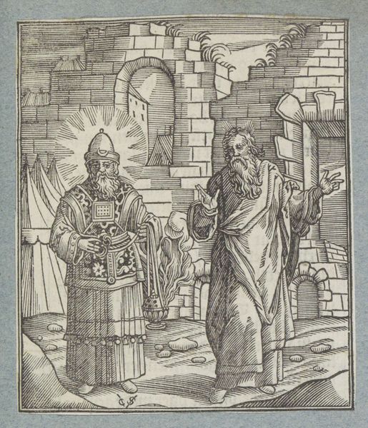 Editor: What a captivating tableau! The monochromatic rendering imbues it with a sense of timeless solemnity. Curator: Indeed. We're looking at "The scene with the two large groups of figures in costumes" by Nicholas Roerich, a drawing. The line work is particularly striking, creating distinct forms and textures even in the absence of color. Editor: The density of the figures certainly draws the eye. What sort of historical labor might be reflected in the creation and use of the costumes, those ornamental patterned hems on the capes in particular? Curator: Note how Roerich arranges them—a study in contrasts. The composition guides the viewer to consider their roles in some narrative, and that arrangement also structures symbolic weight, wouldn’t you agree? Editor: Oh certainly! This drawing resonates with echoes of theatrical performances; perhaps sketches of costumes fabricated at the time? Were these scenes staged for some elite spectacle? Curator: One can certainly wonder what context the work was made, even without concrete details of the commission's occasion or precise history, but I can say its enduring visual strength exists primarily because of the compositional dynamism created with shape. Editor: Well, thinking of its possible connections to labor then shapes the experience of these formal choices. It is intriguing to ponder. Curator: It provides an engagement with this scene of people gesturing across social, possibly political, distance. Thank you for prompting thoughts about production conditions shaping meaning. Editor: And thank you for allowing us to attend to the significance held by shape within art!
