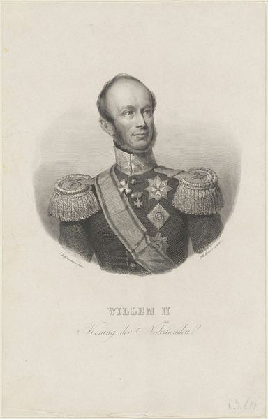 Carel Christiaan Antony Last created this lithograph of Willem II, King of the Netherlands, using a stone plate and printing press. Lithography allowed for relatively quick reproduction. While perhaps not as directly connected to labor as a hand-drawn portrait, the mass production of imagery ties directly into the rise of consumer culture and industrialization. Observe the subtle gradations achieved in the shading, mimicking the tonal range of a drawing. This would have required careful preparation of the stone and precise control of the printing process. The evenness of the print suggests a well-maintained press and skilled handling, reflecting the systematized division of labor in printmaking workshops. Although it depicts a royal subject, lithography democratized image-making, and made portraits more accessible than painted likenesses. The choice of this medium therefore subtly shifts the dynamics of power and representation. Appreciating these nuances invites us to reconsider the hierarchy of art forms.