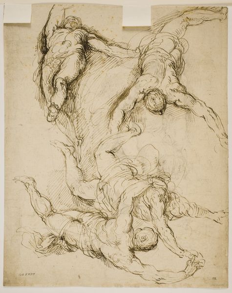 This drawing was made by Giovanni Battista Tiepolo, using pen and brown ink with brown wash on laid paper. Look closely, and you will notice that this is not a spontaneous sketch, but a study of the effects of light on the figures. The drawing is built up of many layers of hatching, cross-hatching and wash, creating a complex interplay of light and shadow. The contrast between light and dark is used to create a sense of drama and movement, as the soldiers try to restrain the fighting men. Tiepolo has deftly employed the pen and wash to capture the complex interplay of bodies, all vying for space and attention. This contrasts with the traditional ideas about drawing as a quick, preliminary sketch. The drawing testifies to Tiepolo's mastery of materials, and the expressive potential of even the simplest media. It challenges us to consider the social dynamics inherent in the labor involved in artistic creation.
