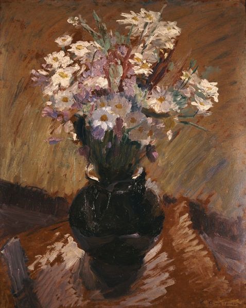 Editor: Here we have Giorgio Morandi's "Flowers," painted in 1942 using oil on canvas. The subdued tones and the rather traditional subject matter give it such a calm, almost melancholic air. What draws you to this particular still life? Curator: It's the very stillness you mention that captivates. Morandi wasn’t just painting flowers; he was painting silence, contemplation. Look how the light seems to coagulate around the forms, blurring the sharp edges. He wasn't aiming for botanical accuracy, was he? What do you think he was trying to capture instead? Editor: Perhaps a feeling, an atmosphere? Something more than just what he saw? Curator: Precisely! Think of Morandi in his studio, day after day, arranging and rearranging the same simple objects. It was a meditative practice, almost devotional. And the limited palette – the greys, creams, earthy browns – lends a quiet dignity. It is as if he's revealing the essence of these humble objects, their quiet existence. Do you notice how he’s built up the layers of paint? Editor: Now that you point it out, I can see the underpainting, especially around the vase. Curator: Exactly! Like faded memories. He wanted to represent the actual lived moments of those flowers rather than just representing an imitation of those flowers. That for me feels pretty moving. Editor: I never would have considered that! Seeing how much emotion is captured, I feel as though I’m witnessing the flowers at different stages. Curator: It’s like capturing fleeting seconds, a whisper rather than a shout. Painting the soul of silence! Editor: That really opens up a new way of looking at something as simple as a flower arrangement.