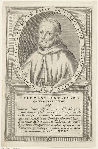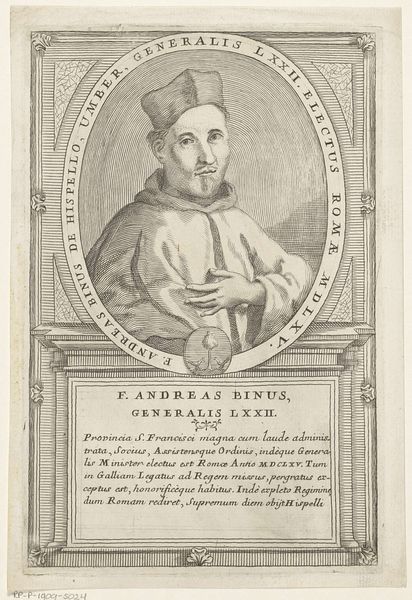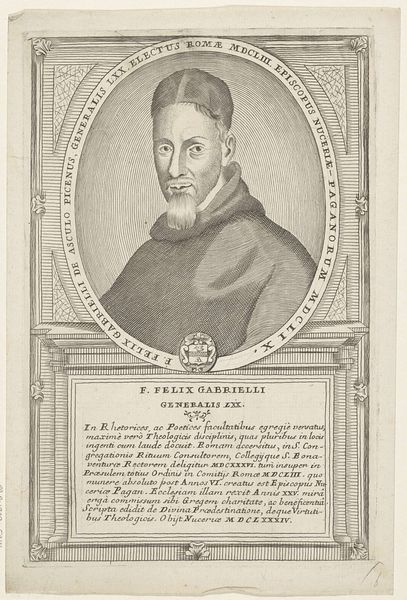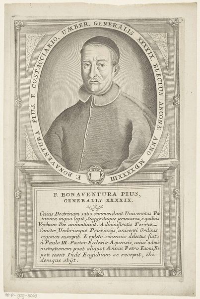 Curator: What strikes me immediately is the level of detail in this portrait. The cross-hatching to build up the shadows, the precise rendering of the fabric...it’s all very deliberate. Editor: Indeed. What we are observing is a depiction of Francisco Bonfigli, 61st Minister General of the Franciscan Order. This print, which was produced sometime between 1710 and 1738, is interesting because it invites us to think about the institutional power dynamics at play during the period and its link to faith. Curator: Absolutely. And think about the way Bonfigli is presented. There's a deliberate attempt to project authority, but within that framework of religious humility. His gaze is steady, but there's no arrogance. Editor: Precisely. Notice the circular frame, almost like a halo effect around his head, and then below it we see inscriptions, texts describing Bonfigli’s career. These framing elements were consciously designed to enforce and augment established modes of idealizing such powerful male figures, reinforcing their perceived God-ordained social position in subtle ways. Curator: You know, there's something quite poignant about the texture of the paper itself. You can almost feel the history it's absorbed. Think about who might have handled it, what kinds of spaces it might have inhabited. The materiality whispers untold stories about the past. Editor: And what of those Franciscan values, the tenets Bonfigli ostensibly espoused? Is the visual representation, this crafted image, actually aligned with principles of poverty and humility, or does it subtly become another mechanism in perpetuating a different sort of ideal, perhaps less congruent to that original intention? Curator: That’s the tension, isn’t it? The attempt to portray spiritual leadership through material means inevitably leads to contradiction. Editor: It leaves you questioning whether we, as viewers centuries removed, have the capability of accessing any inherent 'truth' within this depiction, or if what we truly see is an orchestration of semiotics and power, a symbol rather than an essence. Curator: This work is a powerful artifact—one that leaves you pondering. Editor: I concur.