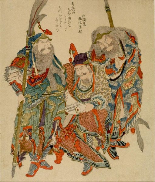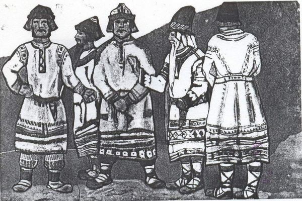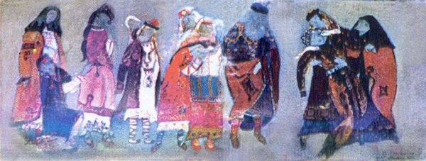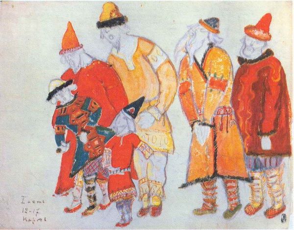 Editor: So, here we have Nicholas Roerich's mixed-media drawing, "Sketches of costumes for 'Prince Igor'." It feels like a glimpse into another world, with all those striking figures in such ornate attire. I am curious; how do you interpret this work? Curator: The cultural memory embedded in these costumes is rich, wouldn’t you agree? Roerich delves into pre-Mongol Russia, not necessarily for historical accuracy, but for the resonance of the *idea* of that era. Note the stylized forms; the patterns, almost totemic in their repetition. What do you make of their similar yet individualized ornamentation? Editor: Well, it strikes me that each figure maintains its own sense of identity, yet is part of a larger cultural unity reflected in the repeated shapes. Are those shapes actually meant to represent something specific, like heraldic symbols? Curator: Perhaps. Or possibly a symbolic representation of cultural belonging. Consider the beard; in many cultures, including early Slavic societies, it signifies wisdom, status, lineage. The variations – colour, length, styling – might represent individual clans or societal roles within Prince Igor’s world. Editor: That makes sense! They aren’t just generic beards; they are markers of identity. So Roerich isn’t just designing costumes; he’s building a visual language. Curator: Exactly! He's invoking the psychological weight of historical archetypes, asking the audience to connect with a past – real or imagined – through potent visual cues. It really illuminates how costumes carry cultural narratives. Editor: I never thought about costumes being read almost like illuminated manuscripts before. It is really quite insightful. Thanks!