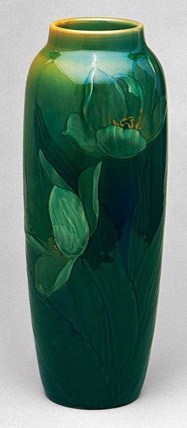 Curator: Immediately, I see something like quiet, mossy magic. What a gorgeous, subtle green! Editor: Indeed. This is the "Covered Vase" created by Josef Ekberg in 1899. It’s currently housed here at the Minneapolis Institute of Art. Notice the stylized floral and organic motifs rendered in earthenware with such deliberate form. Curator: Oh, the plant-like abstractions feel so much like exhaling after a very long day! Is that the Art Nouveau influence at play, this desire for... deceleration? Editor: Precisely. Art Nouveau consciously rejected industrial harshness, opting instead for the organic. Observe Ekberg’s precise contrast between the slightly raised darker elements and the recessive light green ground. The strategic mirroring throughout gives the whole vase this wonderful visual symmetry, creating this harmonious balance. Curator: You’re right, the symmetry is really quite clever. There’s a disciplined elegance amidst the very flowing natural shapes. Almost a dialogue, wouldn't you say, between control and freedom? What does the shape "contain" besides air? Editor: That's a delicious reading of the piece! There’s certainly an intended sense of preciousness to the whole construction and form. Ekberg balances the utilitarian purpose of a vase with high aesthetic considerations. It is, through all its elegant design elements, foremost an object. The artist, Ekberg, through this tension between form and organic theme evokes in the viewer contemplation beyond immediate appearance. Curator: Contemplation and a lovely feeling of rightness. I feel myself breathing a bit deeper, which I suppose, after all, is exactly what I expect great art to do. Editor: It is indeed, a truly immersive experience, don't you agree?