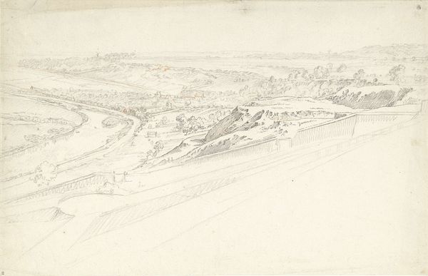 Editor: Here we have Théodore Rousseau's pencil drawing, "Rouaan temidden van heuvels langs de Seine," created sometime between 1822 and 1867. It's such a delicate and almost dreamlike rendering of a city. What draws your eye when you look at this piece? Curator: I'm struck by how Rousseau positions the city, specifically Rouen, within a grand, sweeping landscape. He’s less interested, I think, in the specifics of architectural detail and more in the city’s relationship to the natural world. How does situating Rouen “among the hills along the Seine” affect our perception of the urban space? Editor: It feels almost…vulnerable? Like civilization is just a small part of a much larger system. Is that something artists were exploring during this period? Curator: Absolutely. The 19th century saw rapid industrialization and urbanization, and artists often responded by either celebrating progress or lamenting what was being lost. Rousseau, aligned with the Barbizon school, was firmly in the latter camp. They actively chose rural subjects, highlighting a disappearing way of life. Can you see that in the level of detail he applies to the foliage in the foreground compared to the more generalized depiction of Rouen itself? Editor: I do now! So the looseness of the city’s rendering is actually intentional, emphasizing the enduring quality of the landscape. Curator: Exactly! The pencil sketch aesthetic further emphasizes this ephemerality. How might contemporary audiences have viewed an artwork so invested in this kind of nostalgia? It served as both a reminder of what was being lost and, perhaps, a call to reconsider the relentless march of progress. Editor: That’s fascinating. I always saw these landscapes as just pretty scenes, but understanding the social context gives them so much more depth. Curator: Precisely! Considering art within its historical context helps us unlock its deeper meanings and understand its role in shaping cultural attitudes.