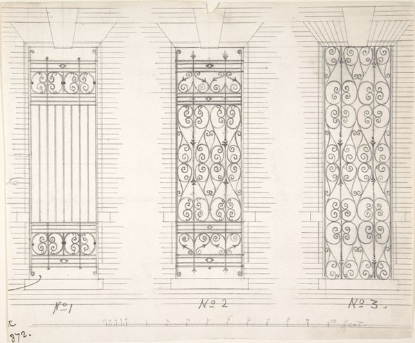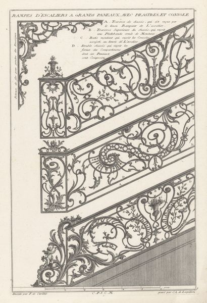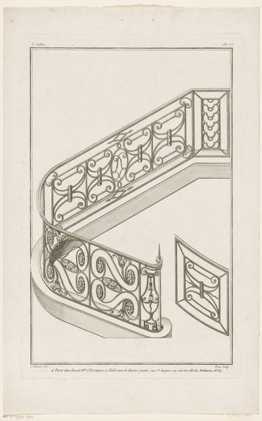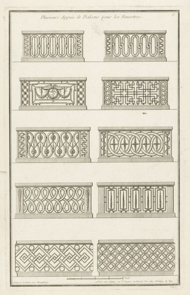 Jean François de Neufforge created this print titled 'Traphekken' with etching and engraving. The image presents detailed designs for stair railings, reflecting the 18th-century French aesthetics where architectural elements were seen as integral to social identity. During this period, architectural design books gained popularity, shaping societal tastes and class distinctions. Neufforge's designs catered to an elite class, where refined details and classical motifs in their homes symbolized status and education. Consider how these railings, beyond their practical use, served as markers of social identity. The imagery encapsulates the complex dynamics of the period, where every element of the built environment communicated social standing and personal identity. The railings offered both physical barriers and symbolic boundaries, reflecting the stratified social landscape of the time. These designs invite us to reflect on the historical contexts that shaped aesthetic preferences and the ways in which architecture encodes power and identity.