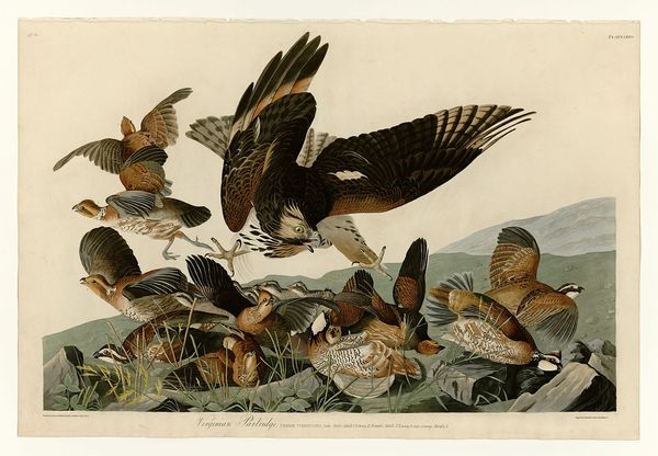 This is Plate 16 from John James Audubon's *Birds of America*, likely made with a combination of watercolor, pastel, and graphite. The image is printed, meaning that Audubon wasn't making one-off drawings, but rather editions. Audubon began with a specimen – a real, dead bird, which he would pose using wires. Only then would he begin to draw. Look at the final result: the hawks are caught in a moment of predatory action. The artist has arranged this tableau to emphasize their aggression, beaks open and bloodied. Beyond Audubon's singular talent, the *Birds of America* depended on a whole network of people. There were the hunters who brought Audubon his specimens, and the engravers and colorists who translated his vision into print. Consider that the making of this artwork was itself a kind of ecosystem. It reflects both the beauty and brutality of the natural world, and the complex relationships between humans and nature.