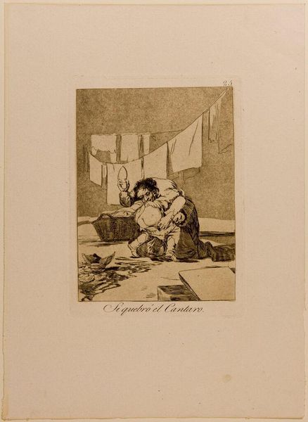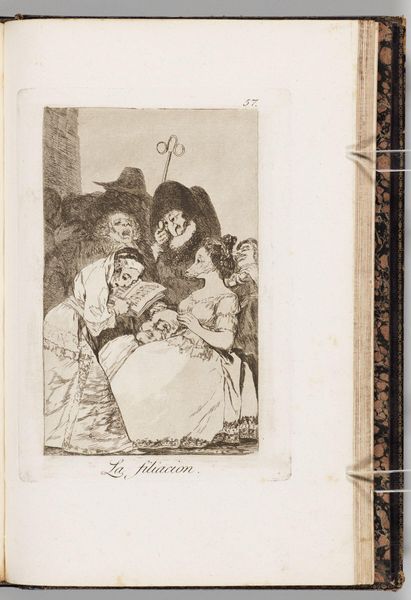 Editor: This is "The Betrothal" by Francisco José de Goya y Lucientes, housed at the Harvard Art Museums. The etching's tone feels satirical; there's an almost grotesque quality to some of the figures. What underlying social commentary do you perceive in this work? Curator: Goya often critiqued the social structures of his time. Consider the title: "betrothal" or "affiliation." It could be read as a commentary on arranged marriages and social climbing. How do the figures' expressions contribute to this interpretation? Editor: The older figures do seem to leer, while the young woman appears passive, almost doll-like. It highlights the power dynamics at play. Curator: Exactly. Goya uses caricature to expose the corruption and absurdity of these social rituals. His works prompts us to examine the power structures that persist within seemingly conventional traditions. Editor: That's a sharp insight. I see now how Goya weaponizes imagery against the status quo. Curator: Indeed, and his prints made these critiques accessible to a broader audience, making his art a tool for social awareness.
