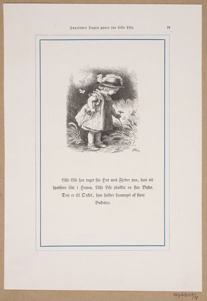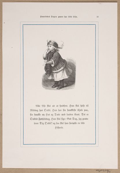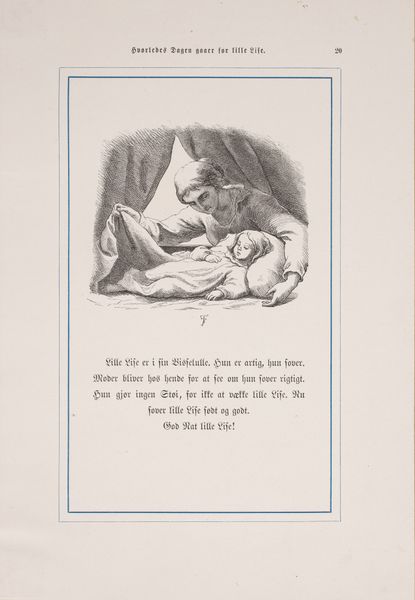Curator: It strikes me as melancholic; the blurring between dream and waking is almost palpable. Editor: What we're looking at is an 1863 illustration by Lorenz Frølich. It’s a print, likely a woodcut or possibly a pencil drawing reproduced as such, meant to accompany the tale "Hvorledes Dagen gaaer for Lille Lise" or "How Little Lise's Day Goes." Curator: The limited tonal range directs us to the central form—the girl embracing her toy. Note how the composition isolates her within the recess. Is that a doorway or a shallow alcove? It sets an intimate stage, almost like a private world carved out from the larger space. Editor: The piece originally appeared in a periodical for children, reflecting the burgeoning market for juvenile literature during the 19th century. These stories, often moralistic, used imagery to engage young readers with contemporary values, but the somewhat somber tone strikes me oddly for a child. Curator: Somber, or perhaps just contemplative? Look at the figure's positioning—slumped, yes, but the line of her back implies a weary resignation. The toy appears less a source of joy and more like a prop or surrogate. Perhaps the intent was to provoke an empathetic response in its audience. Editor: It’s possible, although the sentimentality could have also reflected the wider societal expectation that children should be innocent and innocent of their parents expectations of behavior. The setting looks vaguely domestic, and likely would have instilled feelings of connection in contemporary audiences familiar with similar childhood environments. The illustration then operates not merely as a visual but also a social mirror, prompting reflection of domestic life onto art and vice-versa. Curator: I appreciate your view. Ultimately, this relatively small image packs surprising visual and historical weight. It leaves us much to consider about childhood, representation, and audience reception. Editor: A beautiful fusion of technique and cultural commentary. Indeed a striking reminder of the quiet power embedded in images.