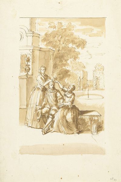 This is a design for a room decoration by Dionys van Nijmegen, made with pen, brush and watercolor. Van Nijmegen created this design in the 18th century, in the Netherlands, during a period when art served a clear public role. Allegorical figures representing the senses were popular motifs in interior design. The statue of the personification of hearing is placed high up within the artwork, as if it were actually sculpted into the wall, highlighting the importance of hearing as the most elevated of the senses. The design incorporates not only the statue but also musical instruments, an open book with sheet music, and a boy playing the flute, emphasizing the cultural and social importance of music in Dutch society. To understand this design fully, we could research Dutch interior design and musical practices of the 1700s, as well as the display practices of Dutch museums, galleries and schools.