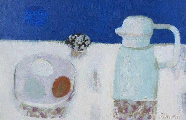 Mary Fedden's 1984 painting, "The Teapot," presents a tableau of domestic objects rendered in a palette of pastels and earth tones. The composition is divided into foreground and background, with a patterned tablecloth acting as the stage for the still life. Fedden uses simplified forms and bold outlines to define each object, flattening the picture plane and disrupting traditional notions of depth and perspective. The teapot itself, adorned with abstract motifs, sits alongside fruit and a set of cups, each element contributing to a visual rhythm of shapes and colors. The juxtaposition of the soft pink sky with the angular chair creates a tension between the natural and the artificial, challenging our expectations of spatial coherence. This subversion of conventional representation invites us to question the nature of perception and the construction of meaning through form and color. Ultimately, the painting affirms the power of art to transform the everyday into something enigmatic and thought-provoking, disrupting the established values of still-life painting.
