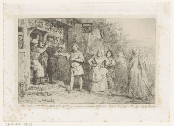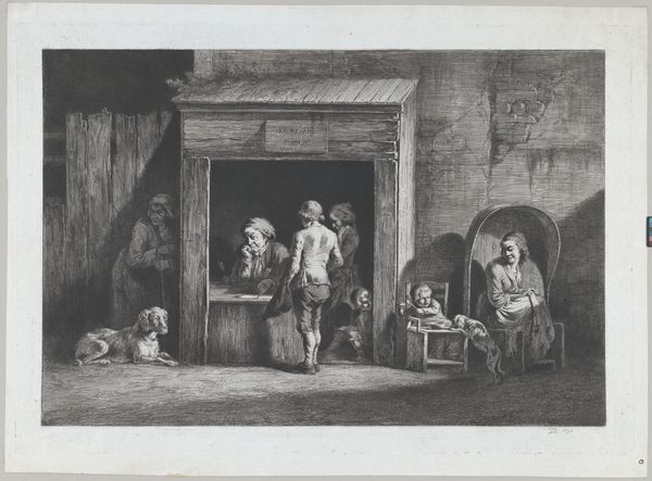 Curator: Let's consider William Ward's engraving from 1792, "Melkmeid en twee boerenknechten bij een stal," or "Milkmaid and Two Farmhands Near a Stable." What’s your first impression? Editor: Dreary, honestly. The muted tones evoke a somber mood. Even the implied romance seems… lackluster. The composition feels cramped, as if everyone's trapped in this rural scene. Curator: Notice how Ward has structured the print. He uses a strong diagonal line from the lower left corner, where the pig roots near a wheelbarrow, upwards toward the embrace. This directs our gaze across the composition. Then there’s the interplay of light and shadow, highlighting key areas of the subject matter. Editor: But what is he highlighting? The sentimental exchange feels forced, staged even. The leering overseer is a disturbing presence, standing between the labor inside and the suggestion of romance. Where’s the milkmaid’s agency in this so-called bucolic scene? This piece speaks more to the social and gender hierarchies of the time. Curator: Interesting take. I would consider that his mark-making lends itself to textures in juxtaposition: The velvety rendering of the livestock’s fur, versus the smoothness of the milkmaid’s pail. It calls into question assumptions about idealization. Editor: I suppose it comes down to intent, doesn’t it? It could be intended as a picturesque snapshot, sure, or as a critique of the commodification of rural life and labor. Are we meant to believe these are idyllic images, or are they really hinting at something more oppressive? Look closely at how the barn itself looms over the workers. This engraving is meant for contemplation. Curator: I can appreciate the visual argument you’re laying out; the diagonals and distribution of dark and light certainly contribute to that emotional impression. Editor: Right. Perhaps "The Barn Door," the alternate title, tells a less-complicated truth about it. The setting itself suggests captivity and an enduring sense of division. Food for thought.
