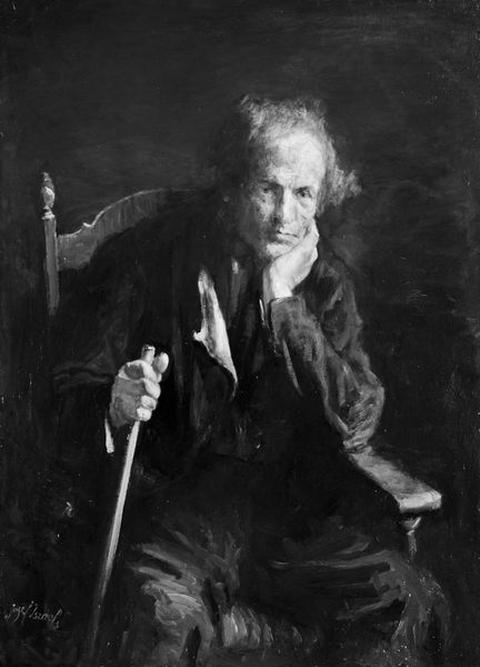 Curator: We're looking at Eastman Johnson's "Portrait of Captain Charles Myrick," a study created in 1879 for his painting, "Embers." It’s oil on canvas. Editor: The immediate impression is somber. The dark palette and averted gaze give it a reflective, perhaps even melancholic, air. There's a definite contrast between the almost monochromatic dark clothing and the brighter, more textured treatment of the face and hands. Curator: Myrick, the sitter, served as a harbor master. It is significant to remember Johnson’s work frequently engaged with the lives of ordinary individuals, embedding them within larger narratives about American identity. It invites us to consider his role within a maritime community. The pipe becomes an important tool through which Myrick projects his class and role. Editor: Precisely. That pipe and hat serve as crucial formal elements guiding the composition. Notice how the angle of the pipe mimics the slope of his shoulders, creating a visual echo, a repetition that draws the eye downward, reinforcing the somber mood. The use of chiaroscuro is also masterful— the way the light models his face and hands emphasizes their age and texture, giving them a tangible quality. Curator: Contextually, we can interpret Myrick as embodying the aging working class whose labor often went unseen. This portrayal asks viewers to grapple with notions of respect and visibility in the face of marginalization. This painting emerges as a poignant reflection on class. Editor: I see it more as the study of an individual. I am moved by how Johnson utilized texture—thick impasto in the face, smoother application elsewhere. I’m very interested in seeing it next to “Embers.” Curator: I agree, a study side by side with the work for which it was produced is quite a treat! Seeing the artistic decisions unfold is enlightening and moving, really prompting important inquiries regarding artistic agency and identity. Editor: Yes, from a purely compositional standpoint, "Portrait of Captain Charles Myrick" is beautiful.