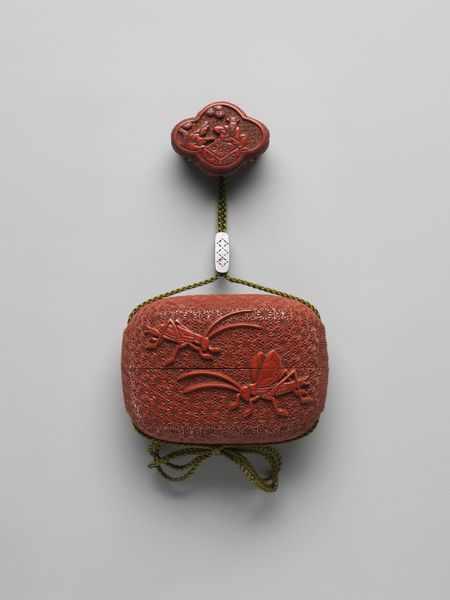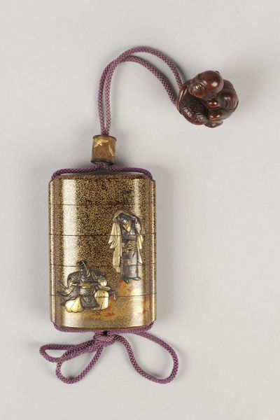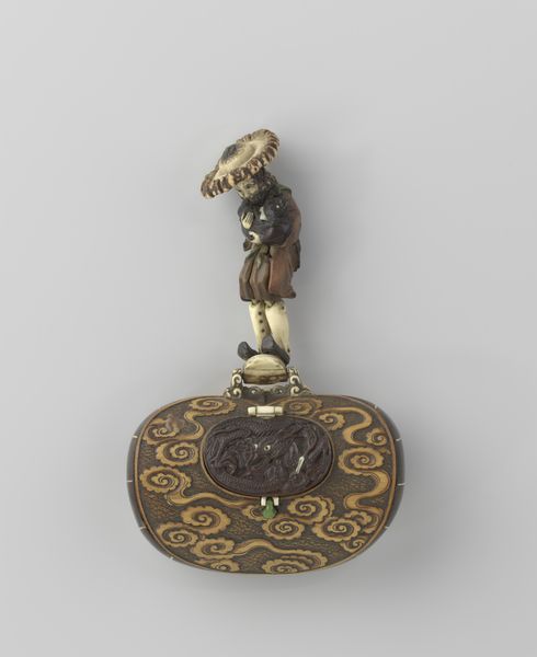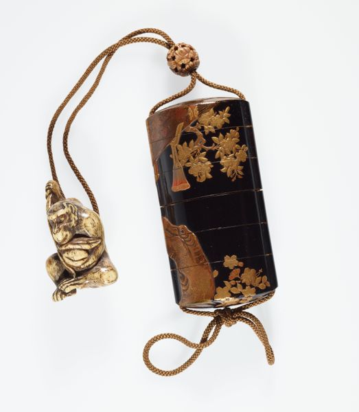 Curator: Here we have a delightful object: an Inrō, or traditional Japanese case, dating from the 18th to 19th century, currently residing at the Metropolitan Museum of Art. Its creation is attributed to Ogata Kōrin. The design features a maple tree and stream. Editor: Oh, my gosh, it's absolutely darling! I'm immediately drawn to the way the shimmering mother-of-pearl contrasts with the dark, almost brooding background. There's something so evocative and slightly melancholy about it, like a snapshot of a forgotten autumn. Curator: It's meticulously crafted. The combination of materials is striking: wood forms the structure, enhanced with ceramic elements, and it is adorned with lacquer, carving and what looks like collage using textiles and different types of metal. Given inro’s function for carrying small objects such as seals and medicines, consider its cultural role regarding self-representation. Editor: Absolutely! It’s an intriguing intersection of form and function. Something tells me its beauty would've sparked joy for the owner during their daily life. I love how the artist transformed something ordinary into a miniature world! The artist is working at that intersection in the visual space between microcosm and macrocosm. Curator: Indeed, there is a fascinating discourse at play concerning identity. During this time in Japan, certain individuals were excluded from demonstrating status overtly. Instead, they manifested personal expression and affluence through what they carried. A piece such as this reflects artistic choices tied to cultural complexities around class, gender and privilege. Editor: It’s almost as if the owner is carrying a piece of poetry with them—the sound of rustling maple leaves and a flowing stream are instantly brought to mind. Imagine its textures in your hand…a silky-smooth lacquer broken by sharp details, and glimmers of light with every turn! Also, can we take a second to consider the artist and his inspiration? Curator: Well, Ogata Kōrin was part of a vital artistic lineage that sought to reinvent classical themes. It is fascinating how someone situated firmly within artistic tradition also engaged with cultural critique through visual language. Editor: Thanks for your expertise! I’m captivated now by the tension between private luxury and cultural commentary… art history gives pieces new stories and layers every time. Curator: It all illustrates, of course, how objects, even miniature ones, have complex sociopolitical reverberations.