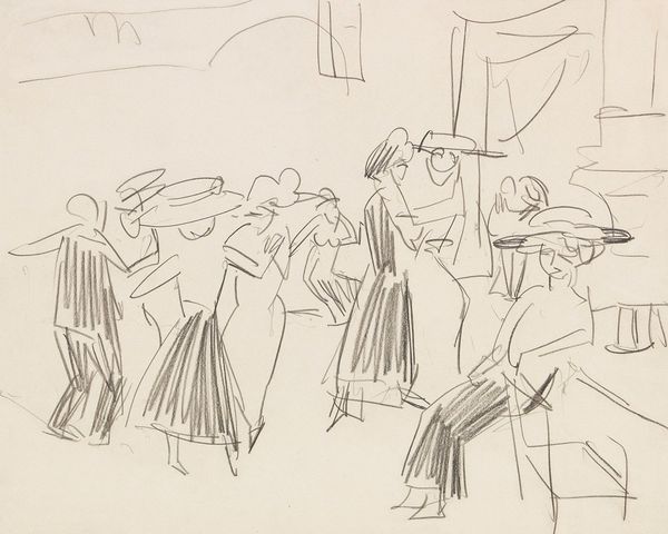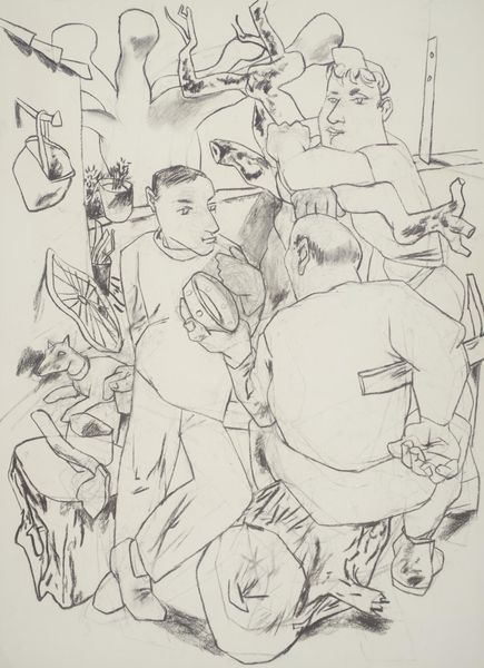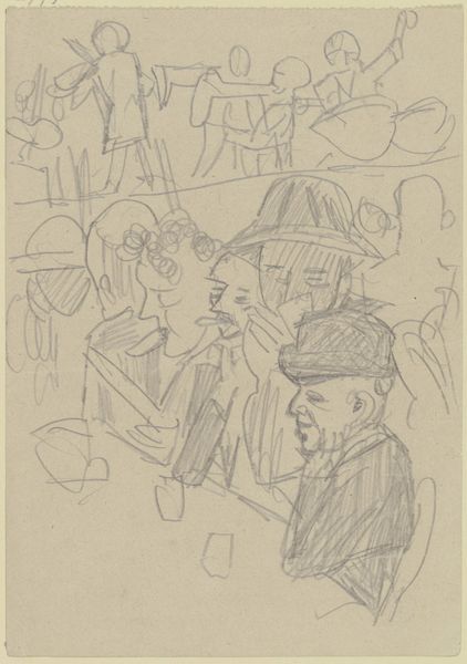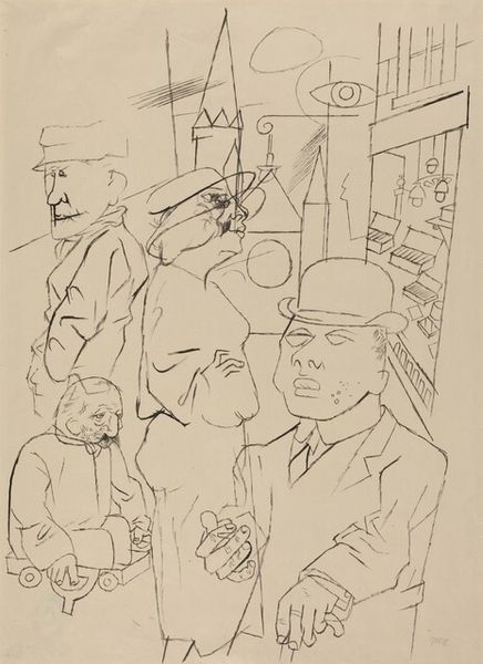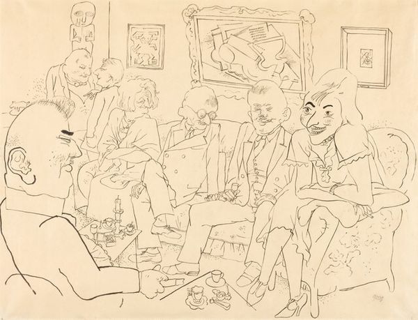 Curator: This ink drawing, presently held at the Tate, is by George Grosz. It is titled ‘Drawing for The Mirror of the Bourgeoisie’. Editor: The linework immediately strikes me; it is sparse yet loaded with contempt, like a swift, brutal caricature. Curator: Grosz’s work, particularly in the Weimar era, was deeply critical of German society. He deployed biting satire to expose the moral decay he perceived. Editor: Note how the composition crams these figures together, amplifying the claustrophobia and perhaps mirroring the societal pressures of the time. Curator: Absolutely. The figures represent types more than individuals, embodying the superficiality and corruption Grosz associated with the bourgeoisie. It’s a condemnation of a class, really. Editor: His use of line is so efficient; each stroke contributes to the overall feeling of unease. It's minimalist yet powerful in its message. Curator: Grosz's critique remains relevant. This piece is a reminder that art can serve as a potent mirror, reflecting back society's flaws. Editor: A very effective mirror indeed—one that reveals the underlying structure of a critical moment in history.