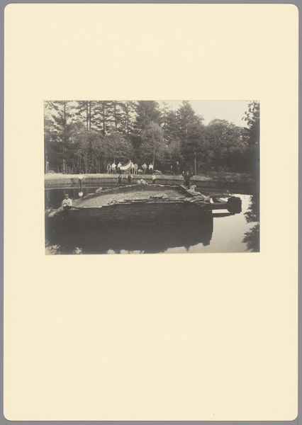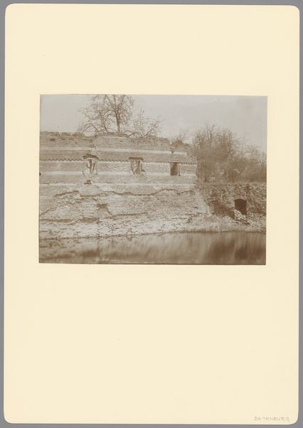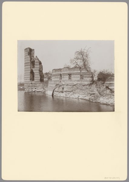 Curator: Oh, what a wistful composition! At first glance, I see echoes of solitude, that profound stillness found in forgotten corners of our history. Editor: Well put. What strikes me initially is the stark geometry. Here, in this anonymous photograph from 1906, entitled "Gedeelte van de kasteelruïne te Batenburg," we have this colossal, almost comical tower, rendered in varying shades of grey, its rigid structure juxtaposed against its dilapidated reality. Curator: Indeed! It's this paradox, I feel, that grips my attention. It is this persistent verticality in the face of degradation. Did it once soar defiantly against stormy skies, only to dissolve gradually? Perhaps now its soul speaks through the reflections shimmering on the water around it? Editor: The way the reflection fractures and softens the rigid form below the water line does add an element of transient beauty. You can read this decay formally in the layered strata of bricks, dissected by the water line which serves as a key structural point within the photograph. These linear layers lead your eye upward towards the ruin's summit. I find the rhythmic repetition almost meditative. Curator: Precisely! But doesn't the darkness peeking out of the empty windows elicit a tinge of… fear, maybe? The abyss where laughter and love probably occurred and vanished... Doesn't the missing pieces make us fill them up using the stories of our grandmothers and of our history teachers? It feels almost personal. Editor: That "personal" reading is an interpretation layered upon formal architecture, perhaps. From the objective viewpoint of the photograph itself, those negative spaces create focal points that invite closer scrutiny. The blackness becomes a shape unto itself, balanced within the composition with other instances of tonal density. Curator: I find I disagree wholeheartedly... to look past emotion and see just line and plane feels...robotic. In the same manner, my old childhood home isn't just wood, windows, and shingles but it also housed my memories, and sadness and excitement and... life. Isn't that true of all relics like this ancient castle? Editor: Well, whether we find the geometry evokes melancholy or objective assessment, the photograph succeeds in creating a potent moment suspended in time. Curator: Beautifully said! Here's to fleeting, poignant glimpses into our forgotten histories, etched permanently on our hearts.