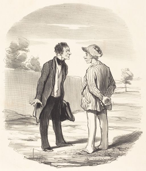 Editor: This is "Je ne m'étonne plus si je ne voyais pas mon chapeau ...," a lithograph drawing by Honoré Daumier from the 19th century. I'm struck by the stark contrast between the two figures and the overall feeling of awkwardness. What's your interpretation of this scene? Curator: Well, viewed through a historical lens, this image speaks volumes about social hierarchies and the role of art in reflecting—and often satirizing—them. Daumier was known for his social commentary, and lithography allowed his work to reach a wide audience through inexpensive prints. What social dynamics do you observe? Editor: I see a clear difference in status. The figure on the left is clearly a servant or valet, holding an umbrella, while the other seems to be a wealthier gentleman searching for his hat. The valet almost looks…resigned? Curator: Precisely. This 'resignation' you see hints at the realities of domestic service in 19th-century France. The title, which translates to "I wouldn't be surprised if I couldn't find my hat..." underscores a kind of cynical acceptance of the master’s behaviour, or perhaps just general misfortune. Think about how this kind of image could both reinforce and challenge existing power structures in society. Do you think that by pointing out societal disparities the artist aims to address political concerns? Editor: It’s interesting you point that out. Maybe it’s not just about humor; it is like Daumier is exposing a truth that people are familiar with but maybe don’t openly acknowledge. Now I wonder if Daumier made similar caricatures of different professional dynamics too, such as law or business. Curator: Exactly. And that widespread social critique is what made his work so relevant and important. Understanding the social and political context illuminates his artistic choices and helps us decode his visual narrative. It seems to offer much more than what meets the eye! Editor: I see that now; thanks for pointing it out!