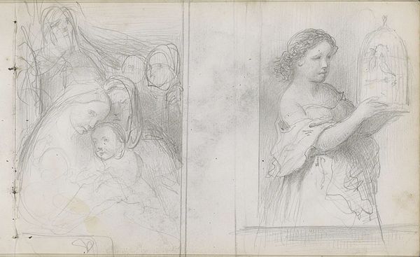 This tiny drawing at the Rijksmuseum, made by an anonymous artist, combines two distinct scenes within the same frame. On the left, we see a close-up of a child’s head, rendered with delicate lines that capture the soft, rounded features of youth. To the right, a farmer stands with his back to us, overseeing two swine in a loosely sketched landscape. The contrast in scale and subject matter immediately draws the eye, creating a visual tension. Each scene, isolated in its own right, offers a glimpse into different aspects of life. The fine lines and precise detail in the child's face contrast with the more gestural, almost casual depiction of the farmer and his pigs. The arrangement of these scenes within the frame invites us to consider their relationship. It's a study in contrasts, where detailed portraiture meets pastoral simplicity, prompting us to reflect on how different elements of life are brought together within the frame of human experience.