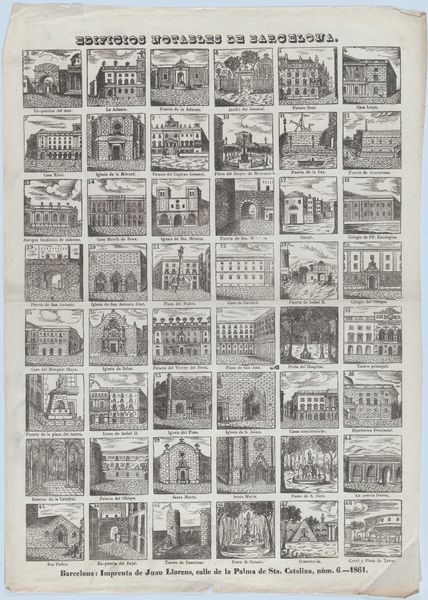 Curator: The "Broadside with 48 scenes telling the 'impartial' story of the civil war in Spain (Part 2)," dating from 1855 to 1865, is a dense visual record. It appears to be a mass-produced print, possibly an engraving. What strikes you most about this piece? Editor: It's overwhelming! The sheer number of images crammed onto the page, the portraits followed by these scenes of conflict… it feels very deliberately documentary in style. What am I meant to take away from it all? Curator: Precisely! Think about the means of production: an inexpensive print, intended for wide circulation. Consider its social function. How does the mass production of images, particularly during a time of conflict, shape public opinion and even become a weapon? What kind of labor and means do you imagine would've been invested in its creation? Editor: So, you're suggesting that even the act of creating and distributing this "impartial" history is itself a political act? And that the choice of the print medium itself reinforces the propaganda aspect? Curator: Exactly. The use of a broadside implies a desire to reach a wide audience, bypassing traditional institutions of art and power. Who had access to these prints? How were they consumed? The materials and their distribution are crucial to understanding its impact. Editor: It’s easy to overlook the significance of something like a print, but considering its place within a wider social and economic system is very helpful. Now I can see it as not just an image of the war but an active part of the war itself, from the point of view of production and labor behind it, as well as consumption. Curator: Precisely, focusing on such materiality opens up avenues beyond a simple interpretation of visual elements. The broadside’s story becomes enmeshed in the broader political economy of the era.